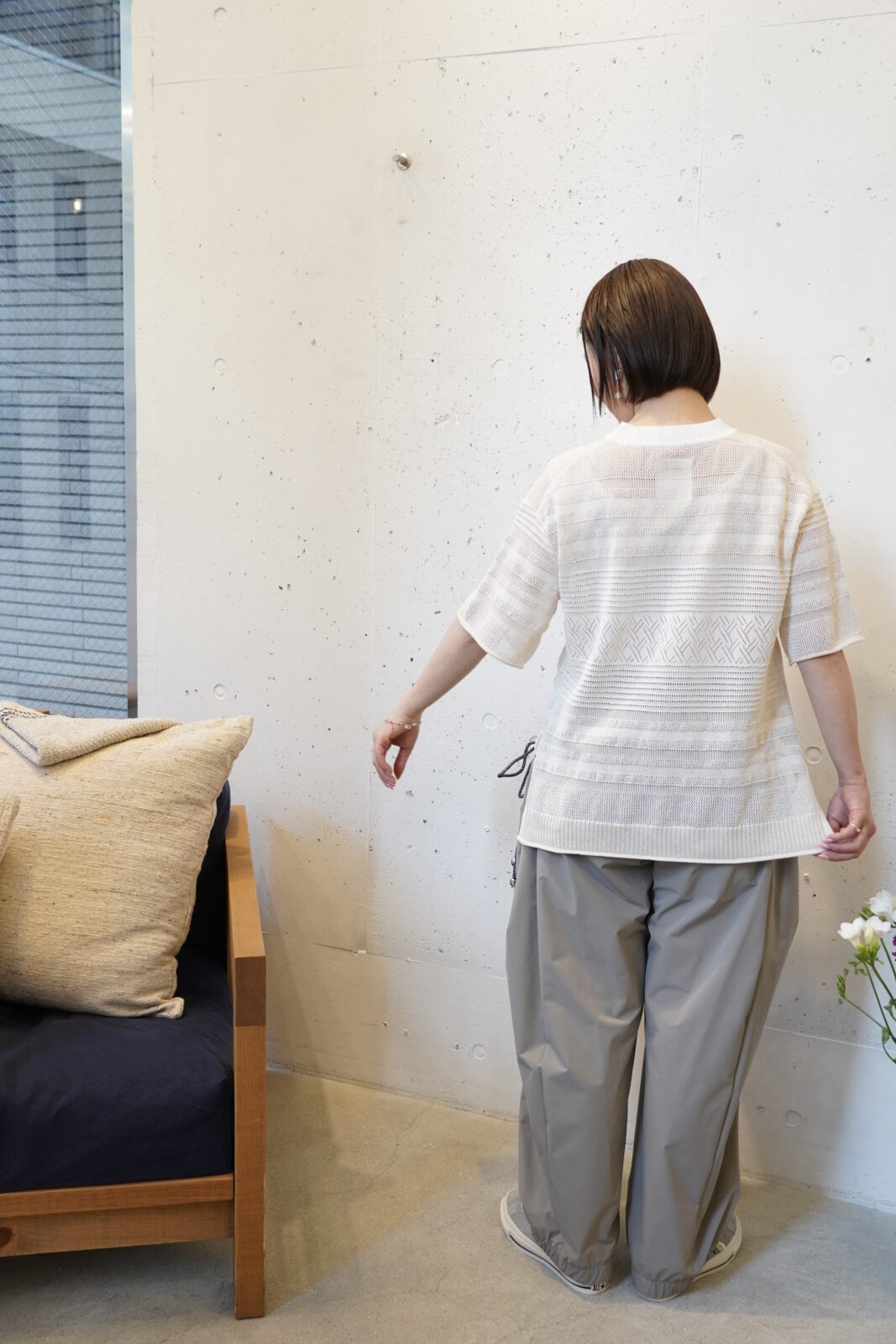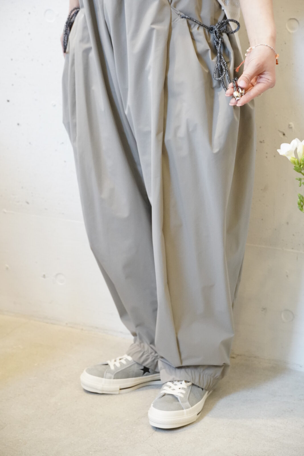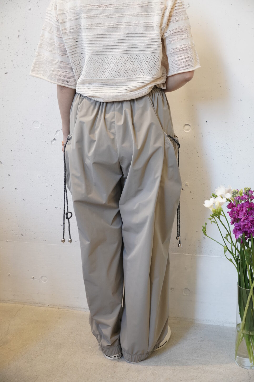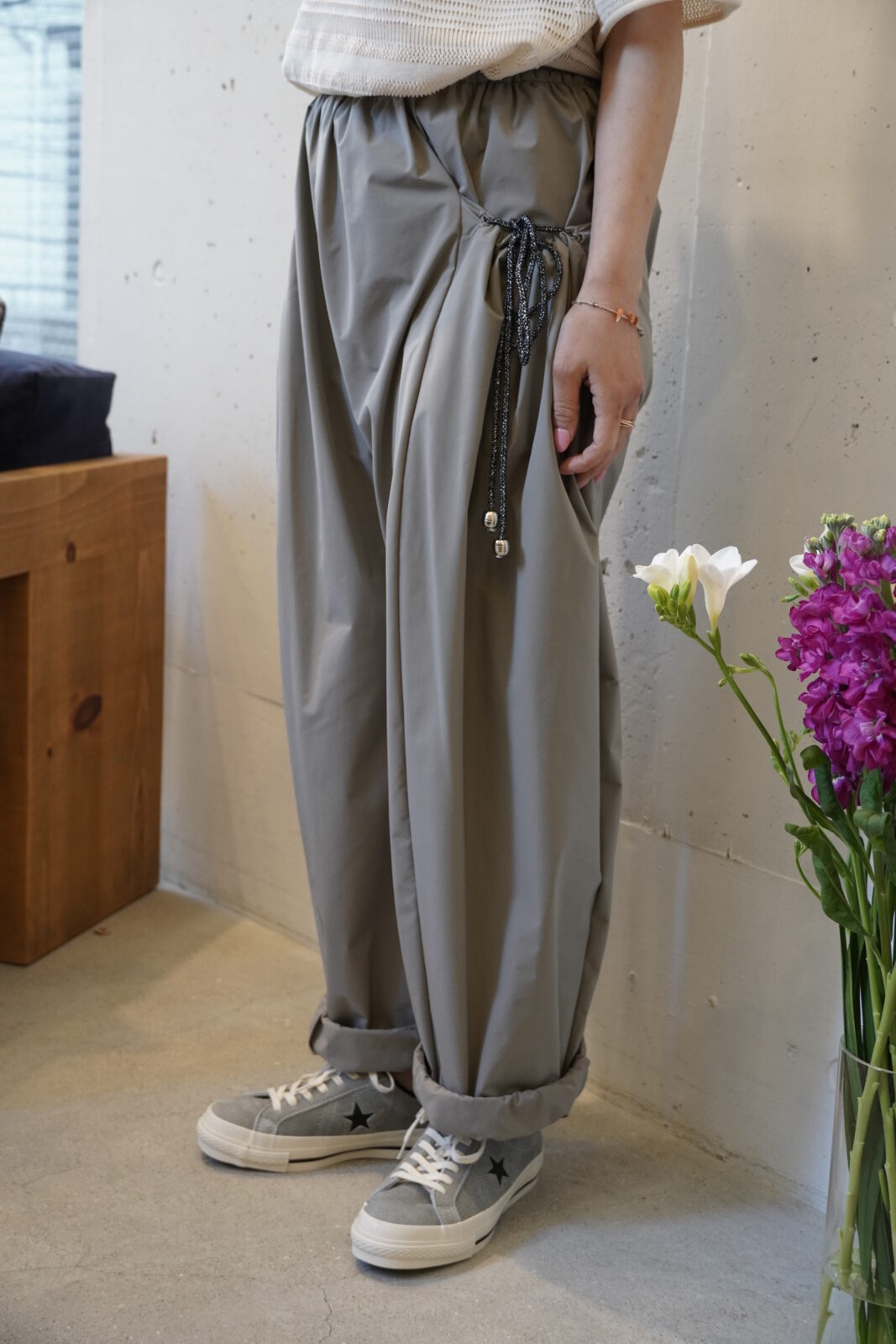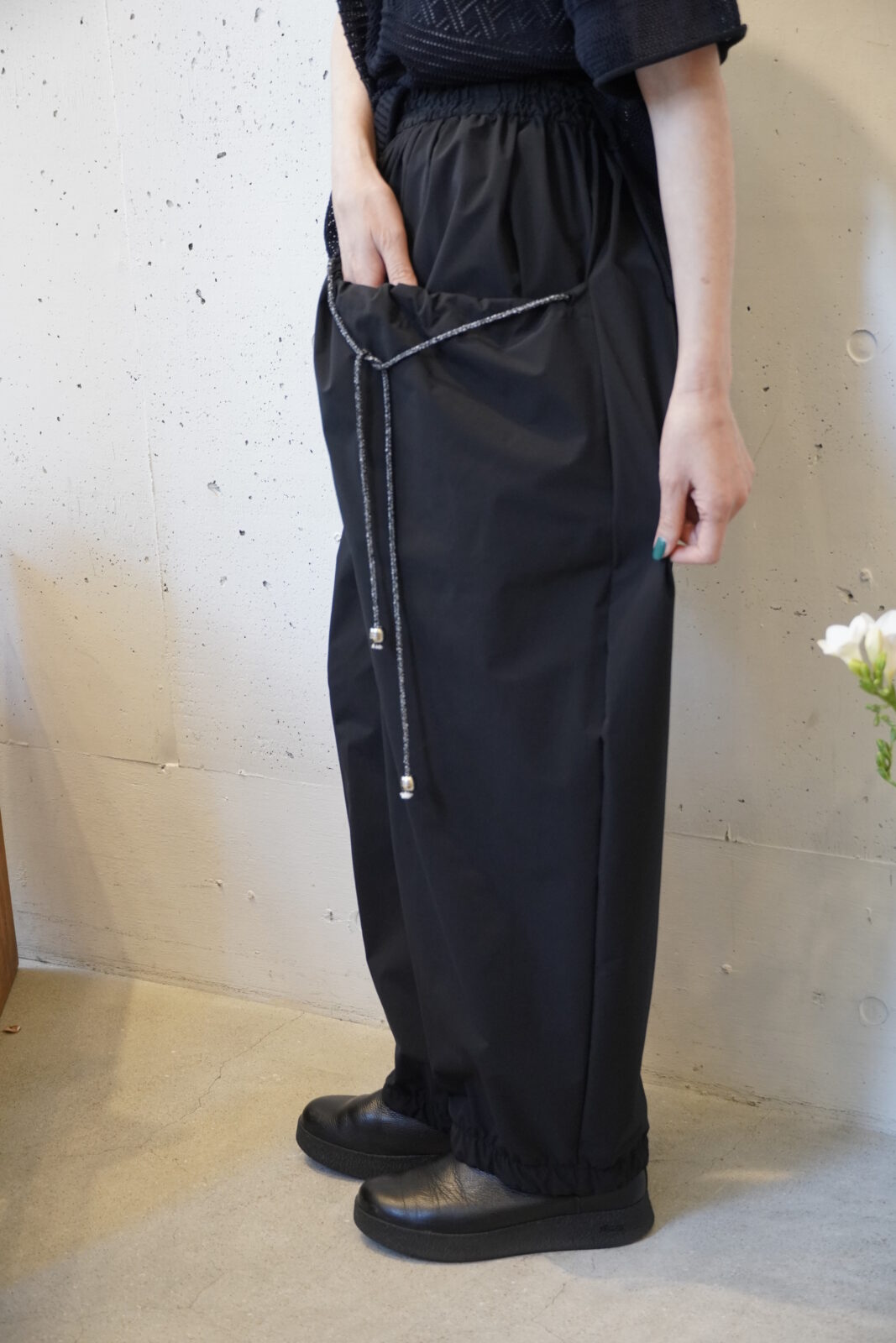 こちらも高密度に織られた軽やかなワイドストレートパンツです。程よいシボ感とハリ感があり、シワが目立ちにくいのも嬉しいポイントです。夏でも快適に履いていただけます。