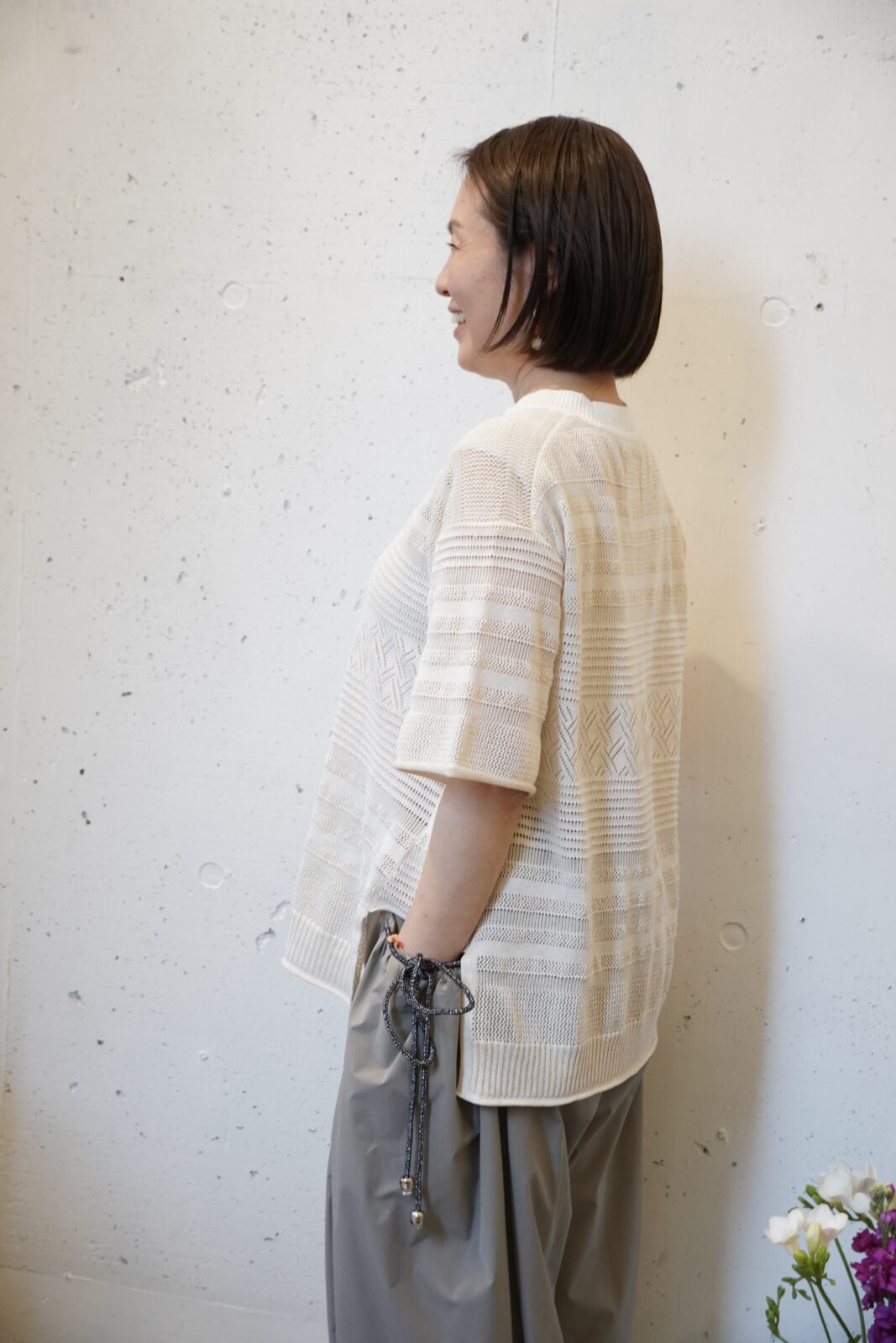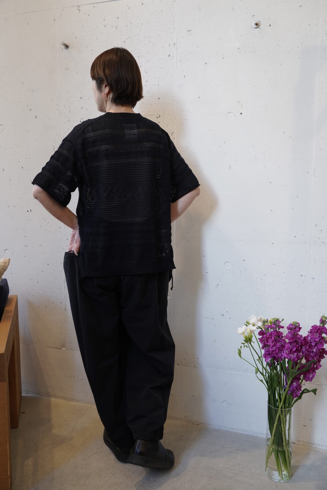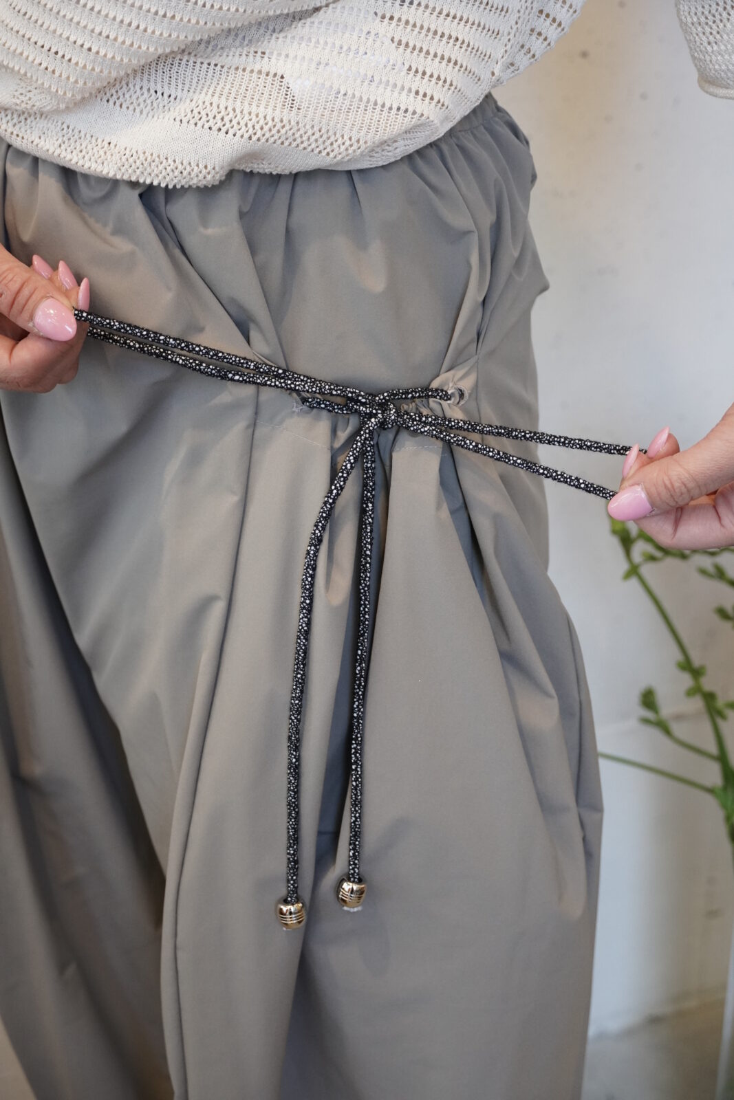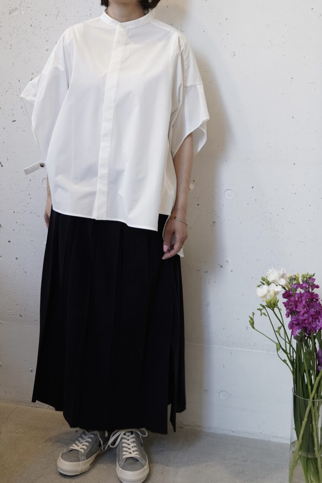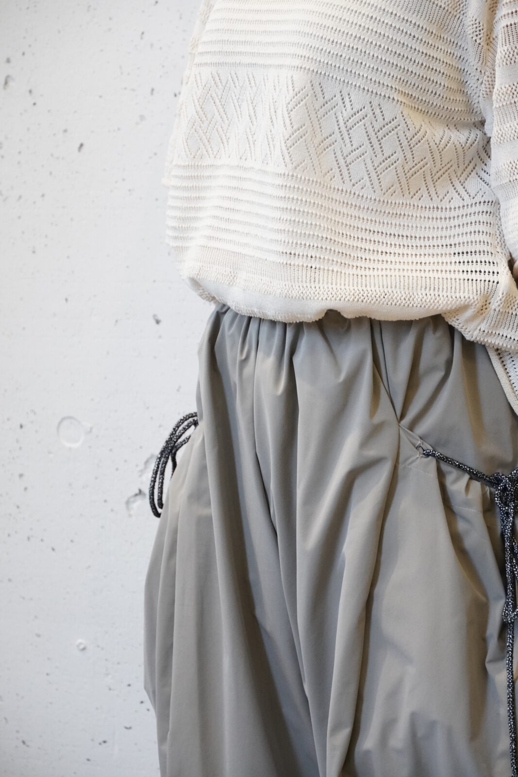 こちらも高密度に織られた軽やかなワイドストレートパンツです。程よいシボ感とハリ感があり、シワが目立ちにくいのも嬉しいポイントです。夏でも快適に履いていただけます。
