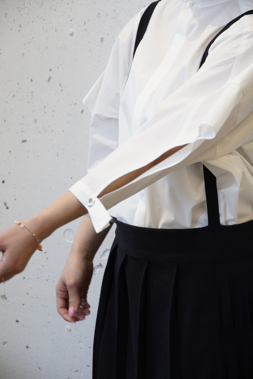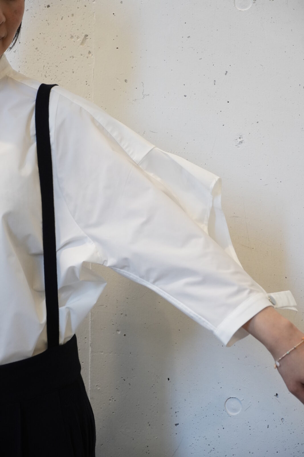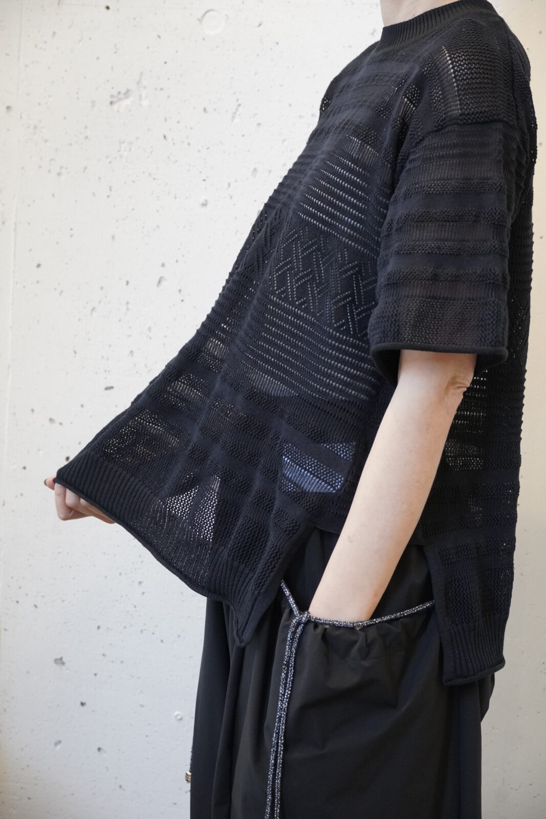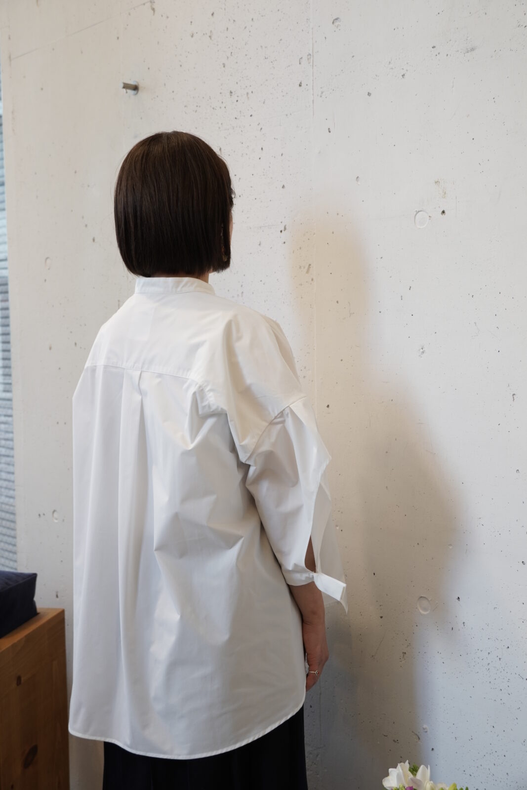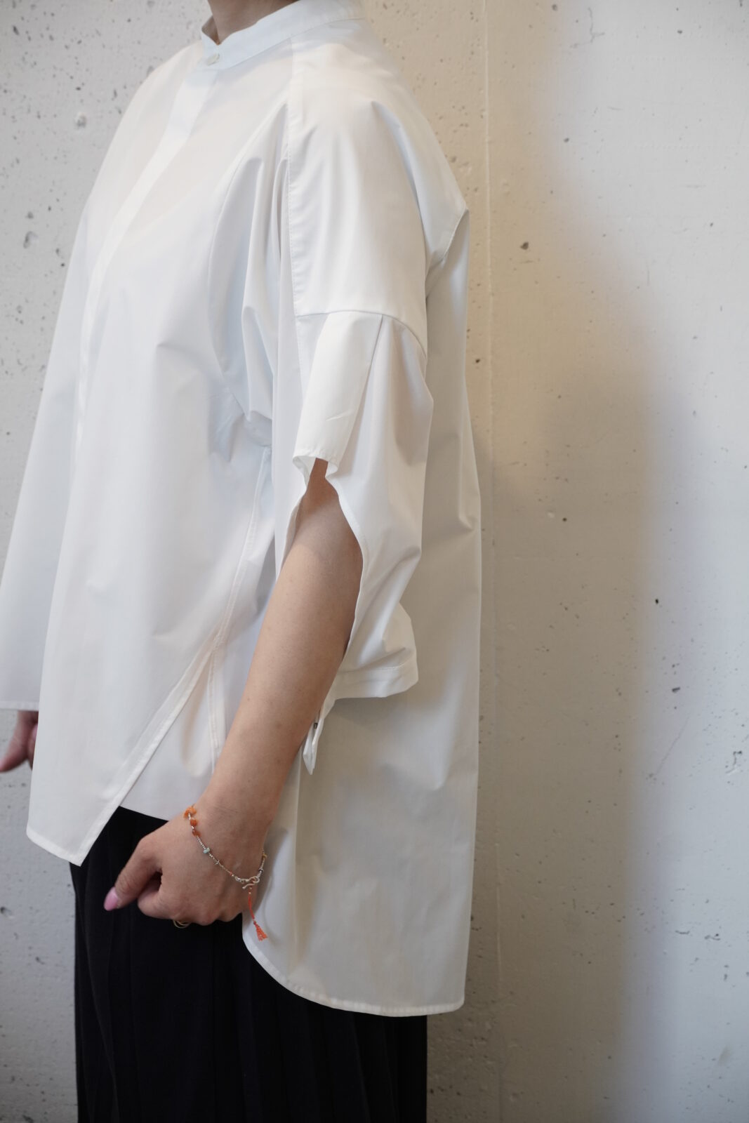 腕を上げてみると長方形に(^^)たっぷりと生地が使われていていますが、着てみるとすっきりとしていています。体のラインも気にならず、幅広い体型の方に着ていただけます。