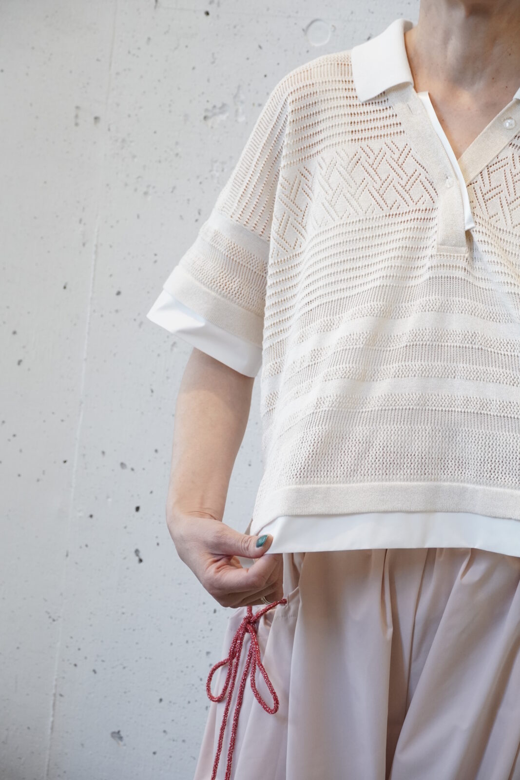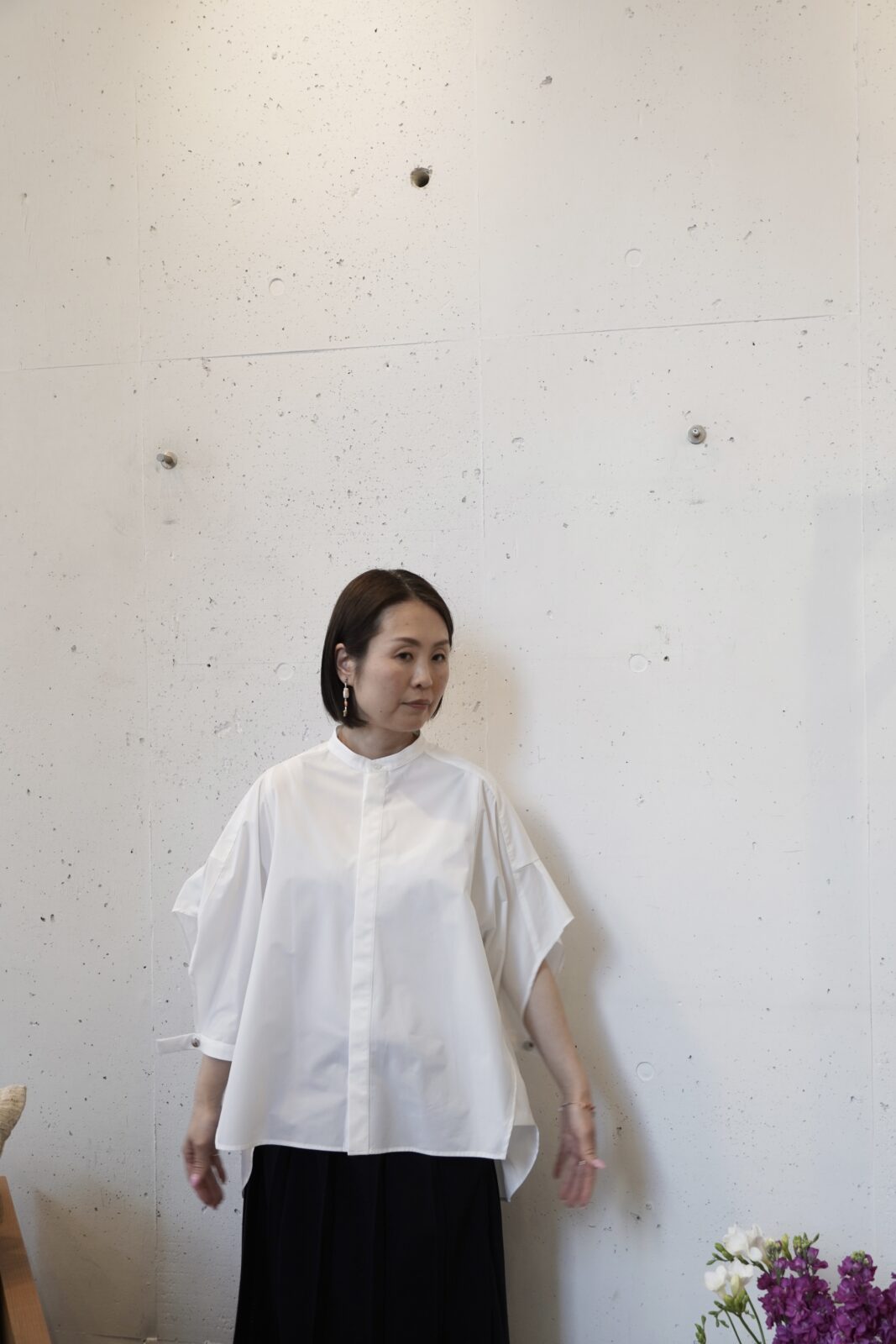 コットンリネン素材ポンチョブラウス。自然なシワ感が和紙のようにも見えて生地に表情があります。
