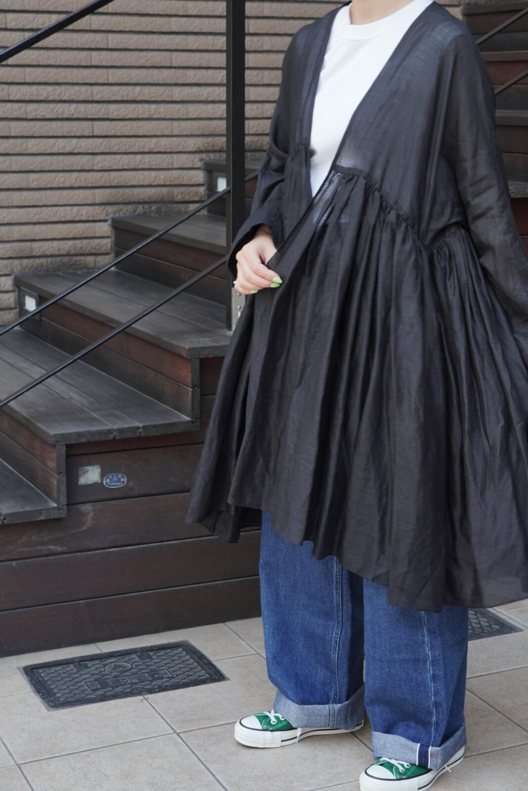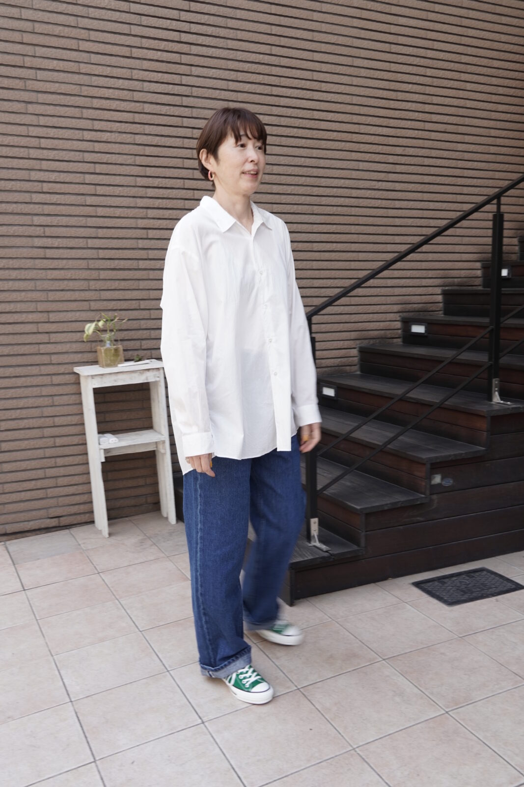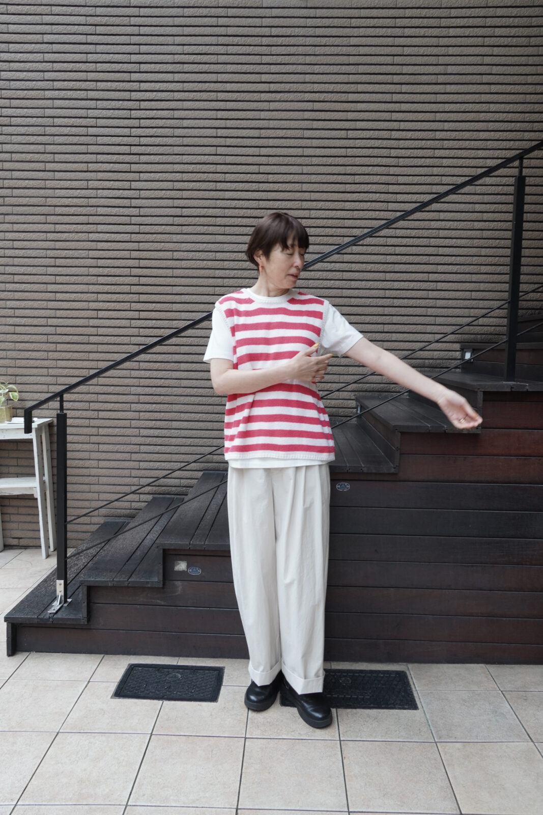 肌に沿わないシルエットとさらさらコットンの素材が真夏でも快適に穿いていただけそうでおススメです。着用している色は beigeでサイズは0。charcoal もございます。