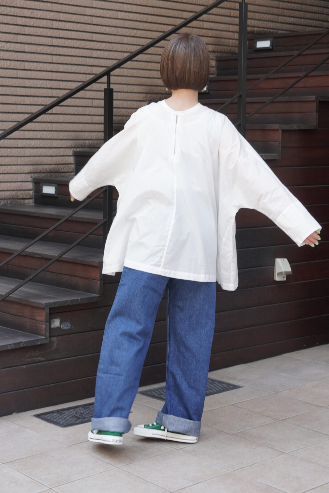まず1つ目はワイドブラウス。程よい光沢感があり、柔らかくそれでいてしっかりとした生地感です。ゆったりとしたシルエットはオーバーすぎず、中に長袖を重ねたりアウターの中にも着やすいサイズ感です。1枚でサマになり、前後どちらも着用可能なので、2通り楽しんでいただけます。
