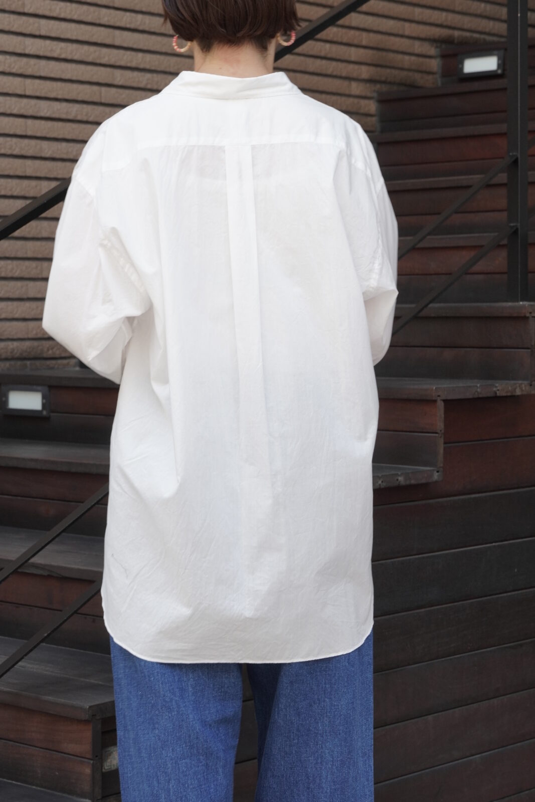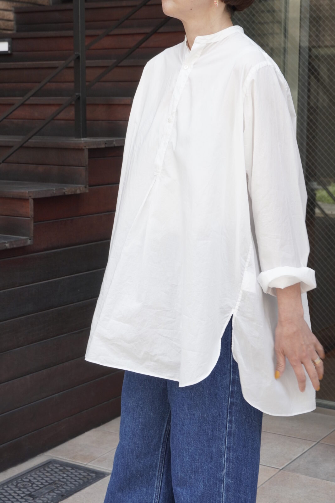 シャツは首元がすっきり見えるバンドカラーシャツ。