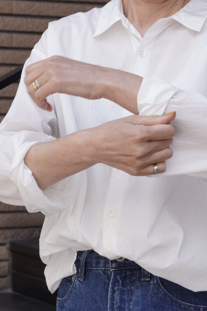 定番ぽく見えてぜんぜん他のものと違う。メンズライクな雰囲気のなかにも素材の良さが引き立ちすごくオトナ。襟が苦手な方もパキッとしてないので開けて着ると首の詰まりも気になりません。