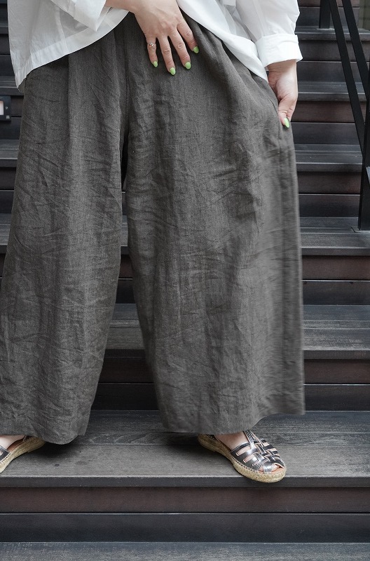 ウエストはゴム紐仕様でゆったりとした着心地です。縦横に違う番手のリネン糸で織られており、生地に表情があり、ブラウンの色合いが素敵♪気になっていただいてる方も多いパンツです。持っていたらこればっかり穿いてしまいそう(^^)