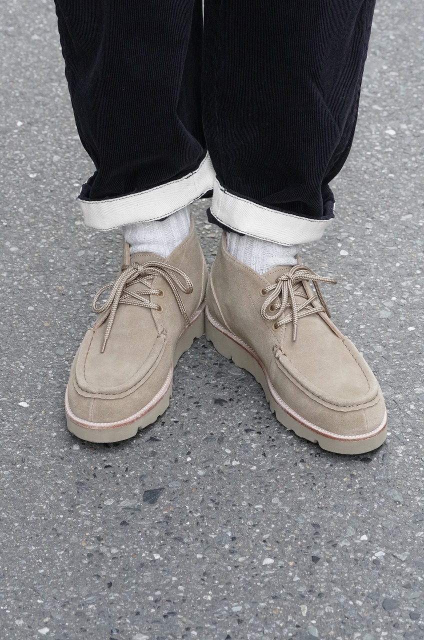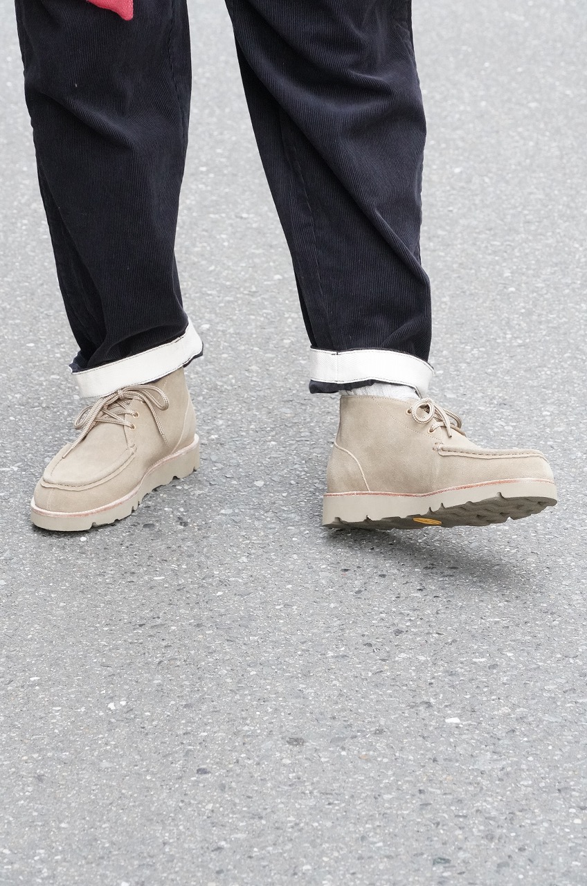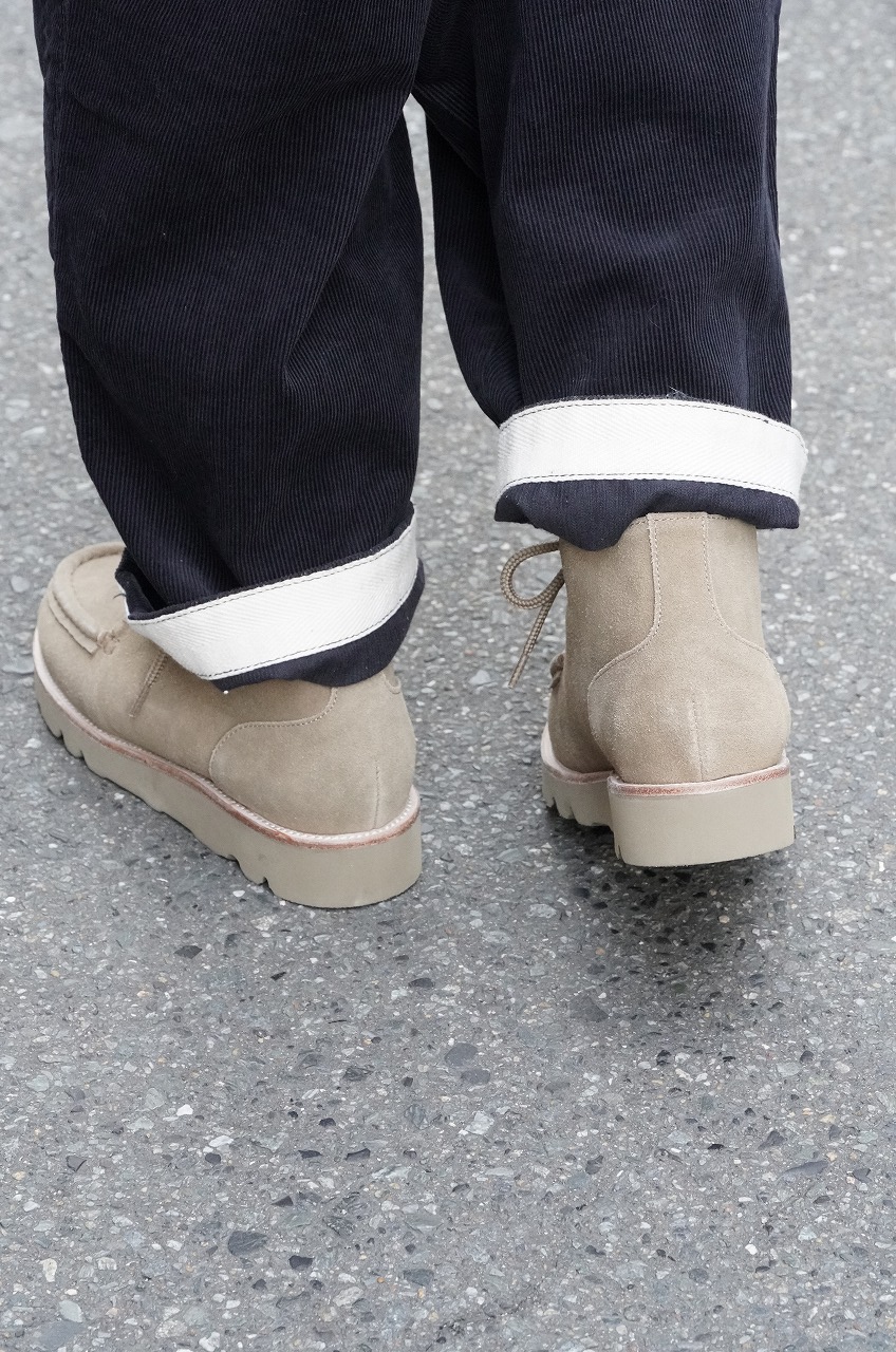 毛質はすごく柔らかいスエードで、紐も紐通しの良い柔らかい紐が使われていたりと丁寧な作りになっています。つま先部分は割とシュッとしていますが、横幅はゆったりめになっています。色を付けてないコバ(靴底の側面)に白ステッチですごく洗練されたこだわりを感じます。