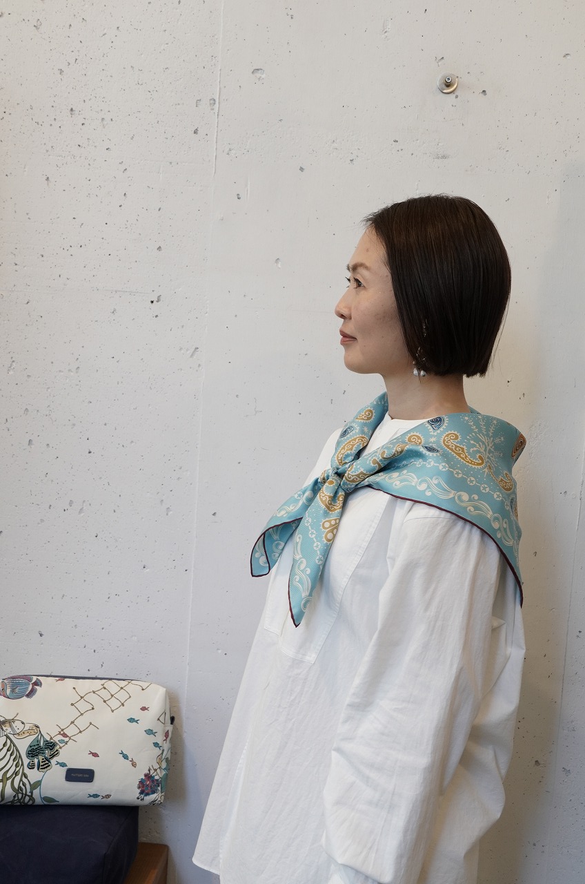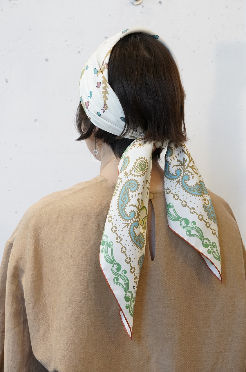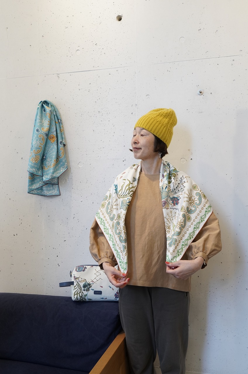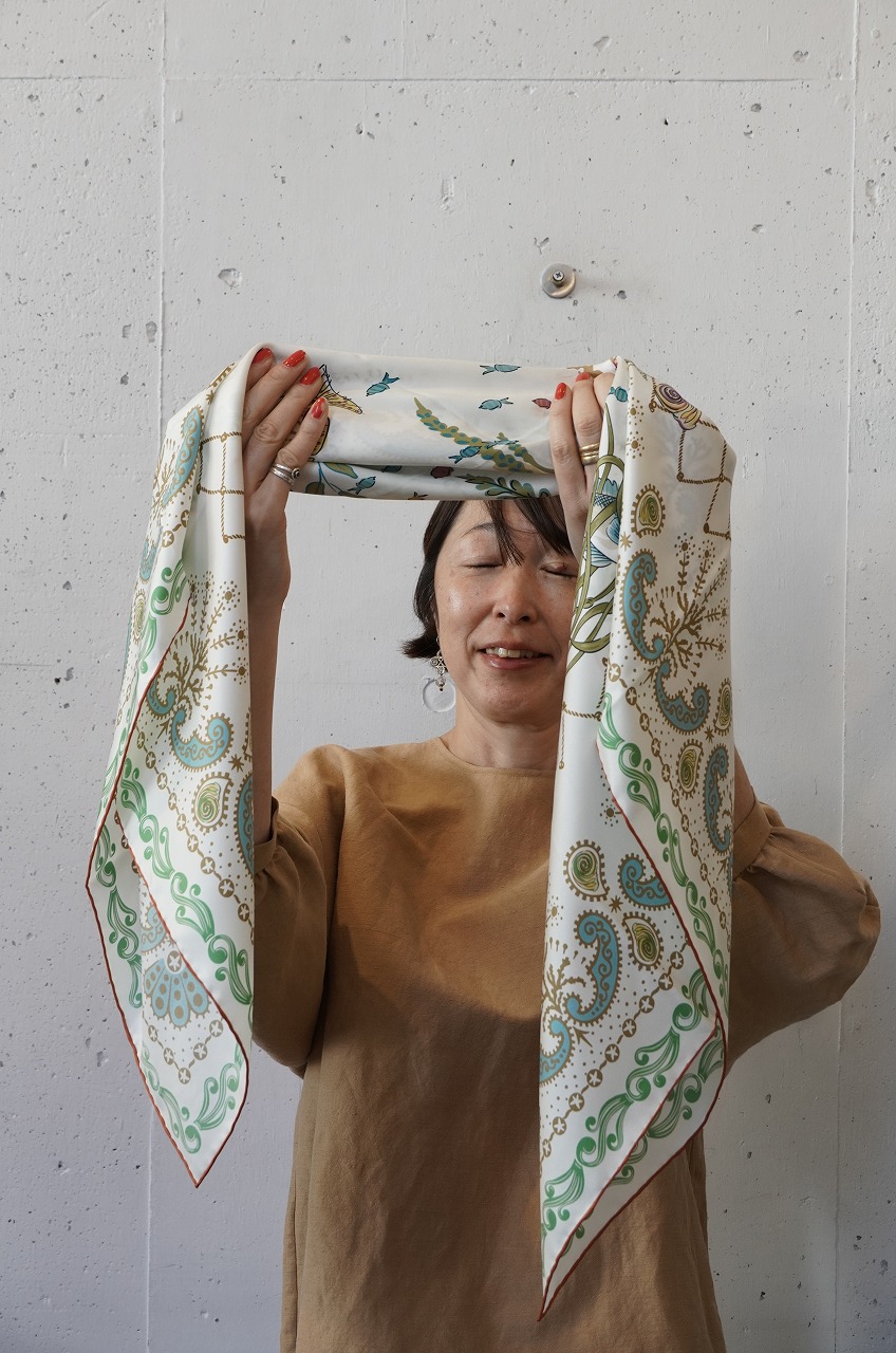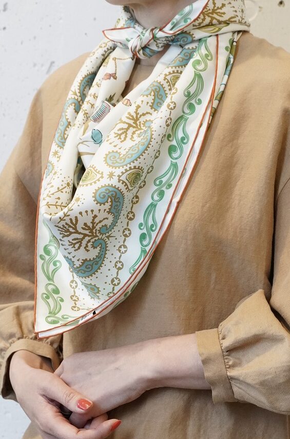先程の水色の大判スカーフのお色違いのアイボリーは、絶妙な配色で大人な1枚です。