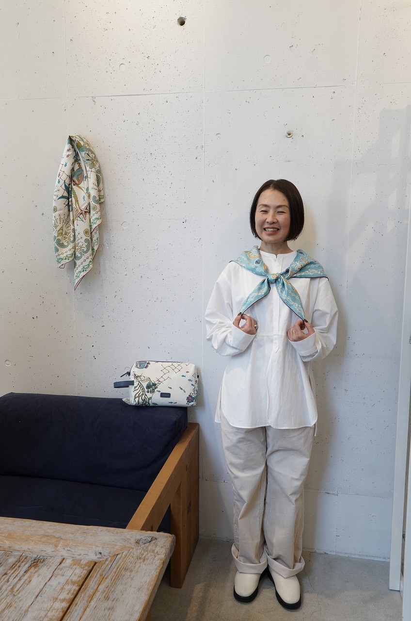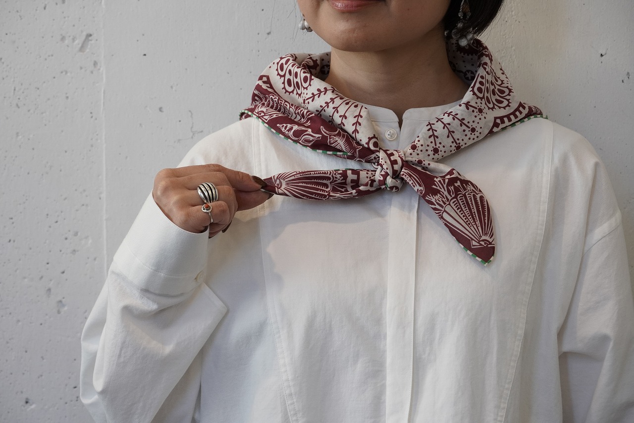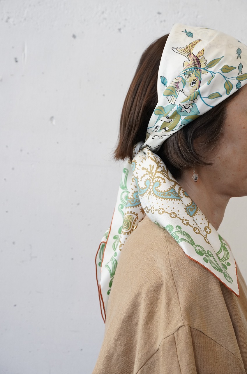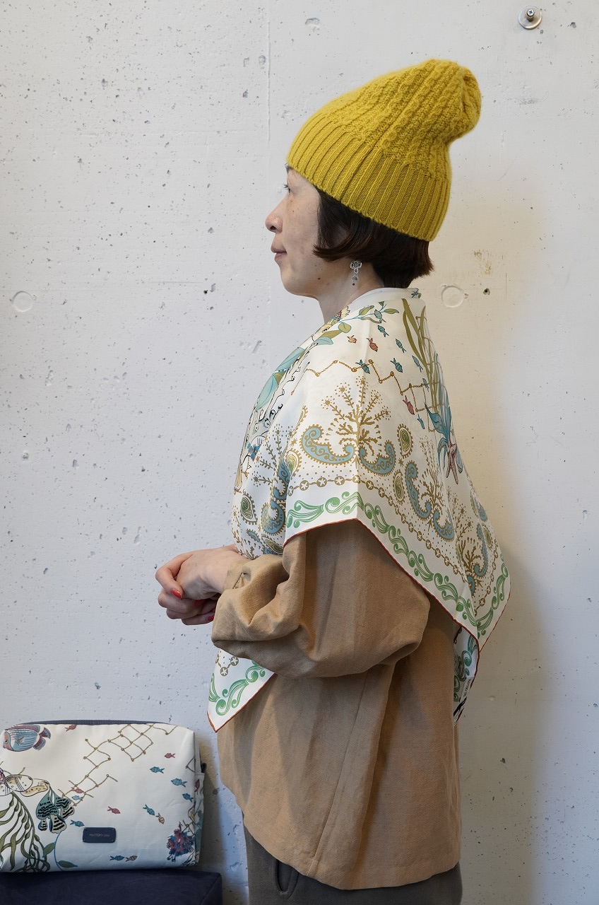 先程の水色の大判スカーフのお色違いのアイボリーは、絶妙な配色で大人な1枚です。