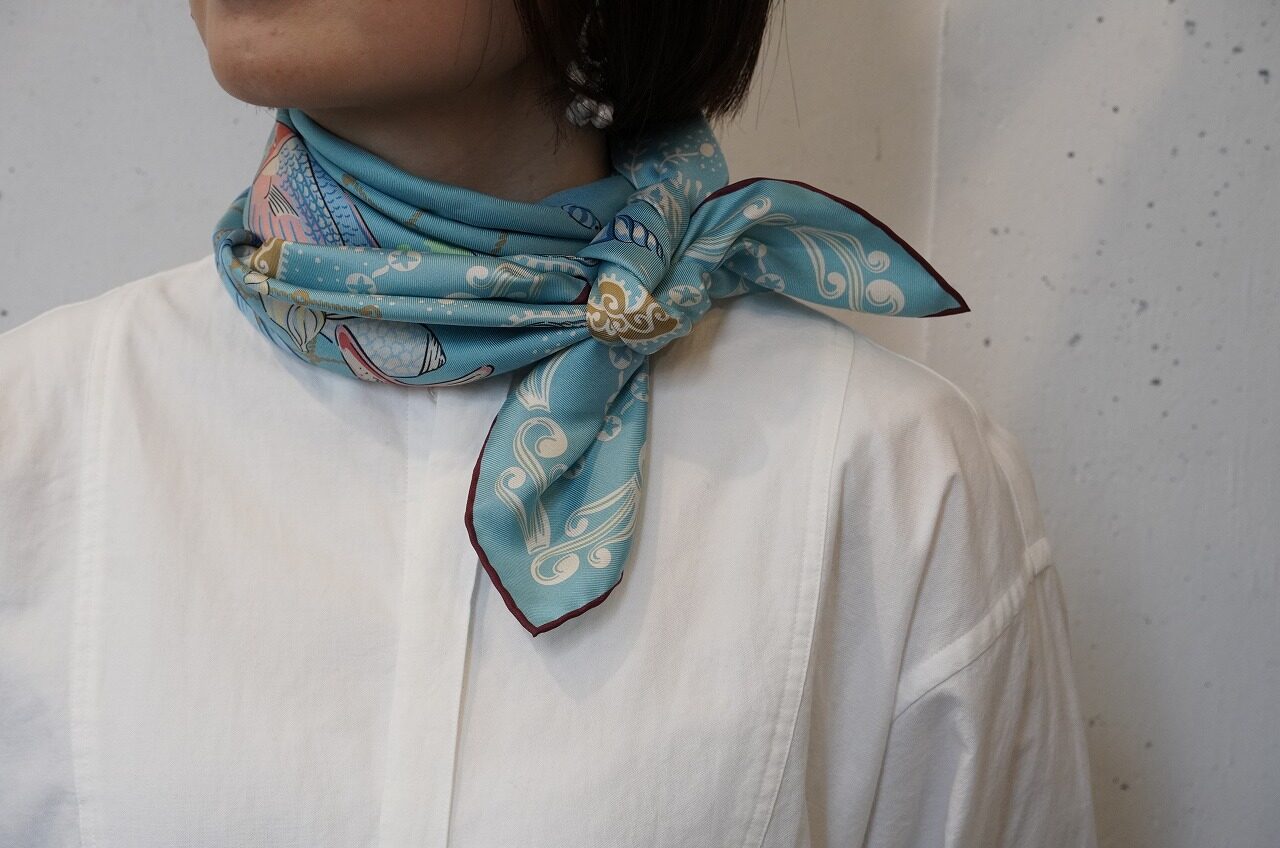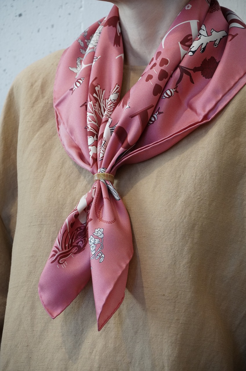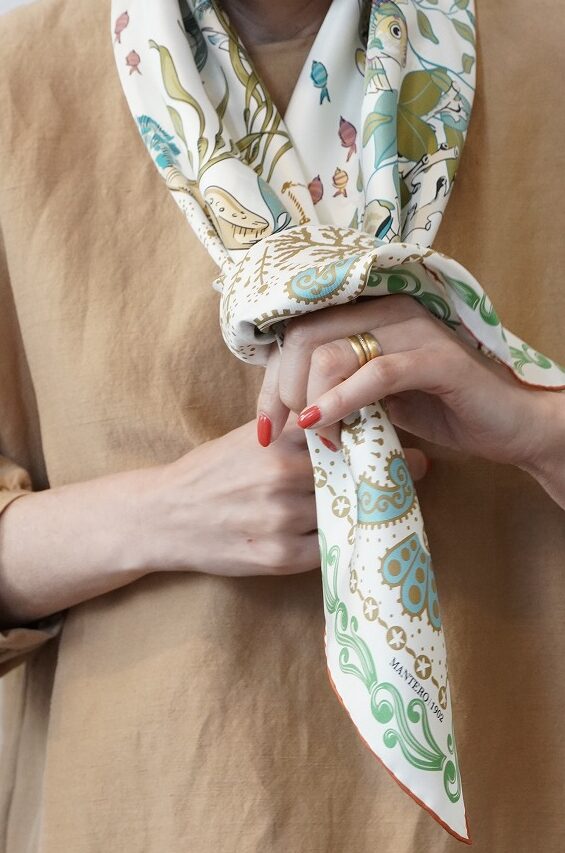 実は私はスカーフ初心者です。以前からスカーフを取り入れたコーディネートをしたいと思っていて、この素敵なスカーフをお嫁に迎えたので、スカーフデビューです(笑)