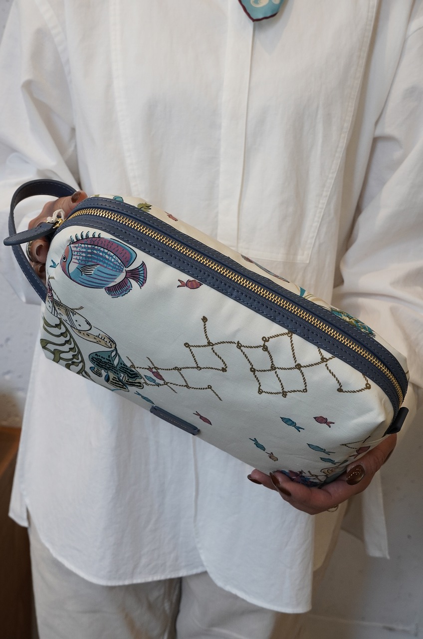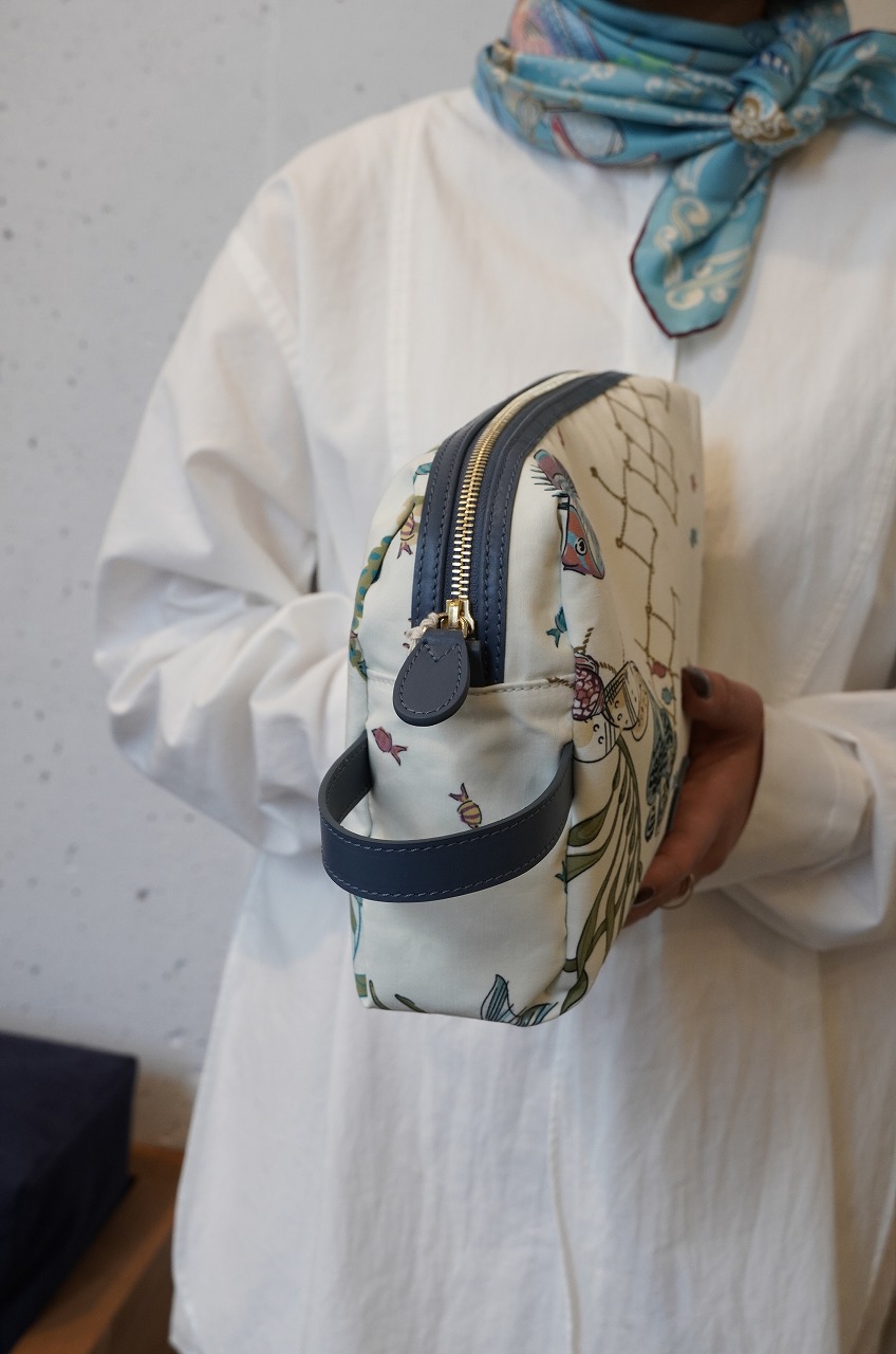 ハンドルとファスナーの部分がレザー仕様になっています。ポーチとしてはもちろん、ハンドバックとしておでかけの時に持っていただきたい、遊び心のある大人なバックです。