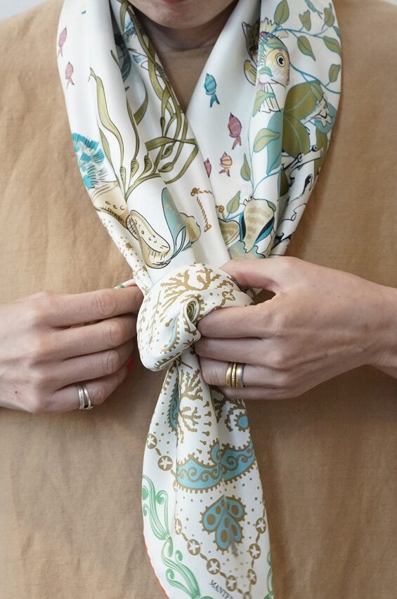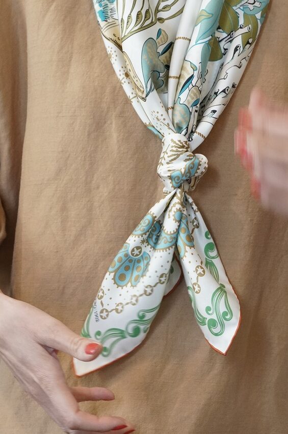 折ったスカーフを首元にさらっと巻いて、結び目を後ろに持ってくると、チョーカーのようでシンプルながら華やかな印象になります。
