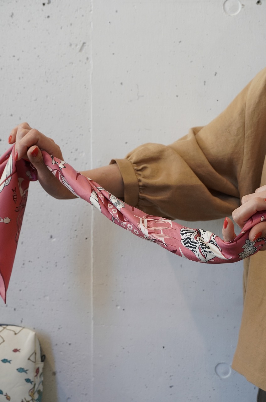 シンプルなスタイルにも、華やかさと上品さがプラスされますし、発色の良さが顔まわりを明るく見せてくれますね。巻くだけでいつものスタイルがワンランクアップします。上質なシルクの持つ光沢を楽しむことができます。