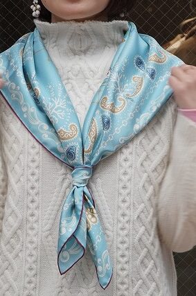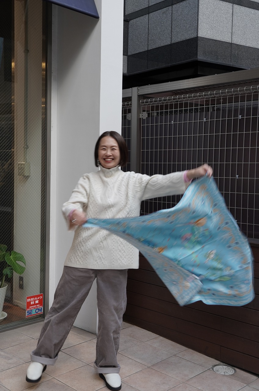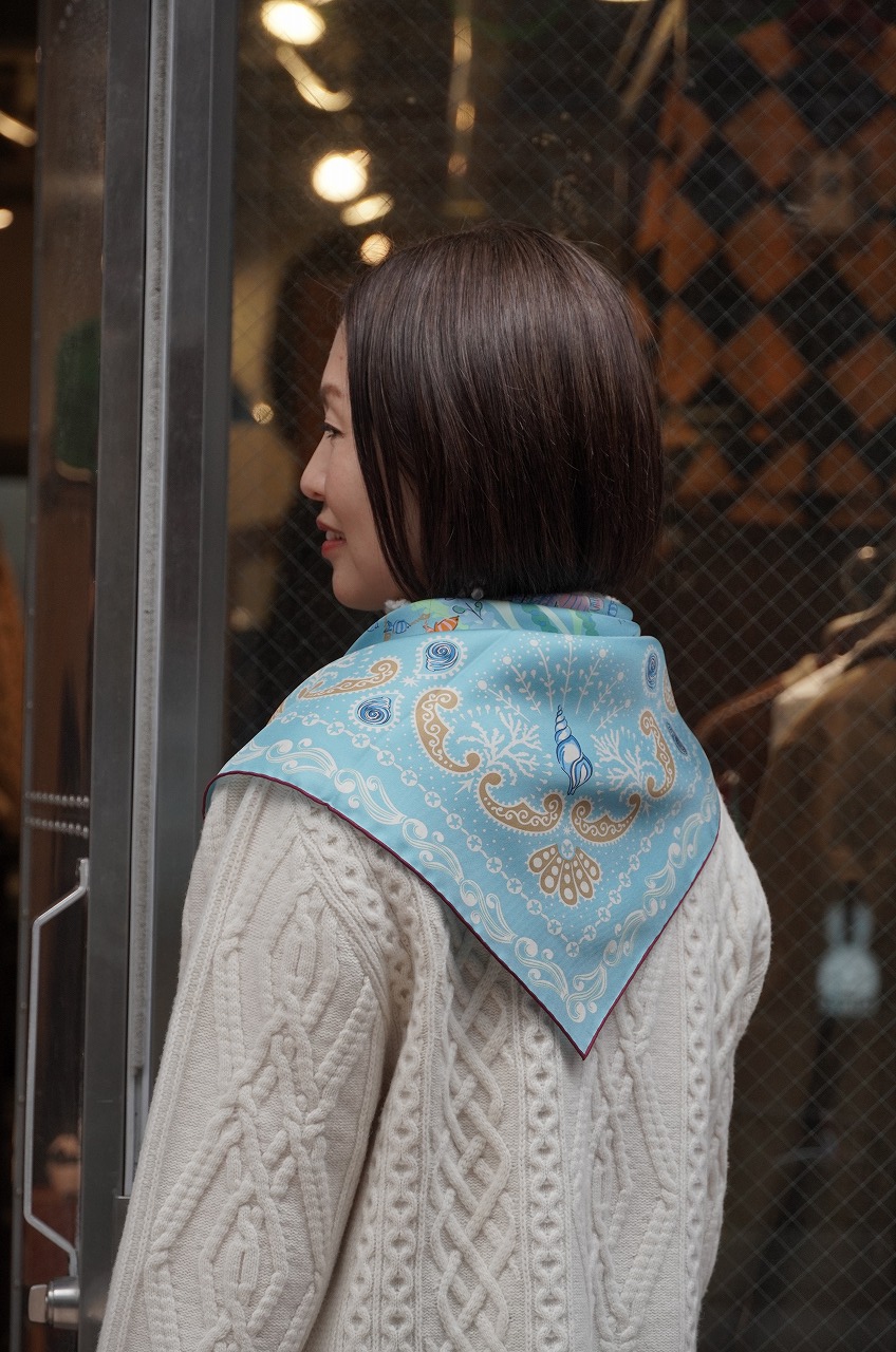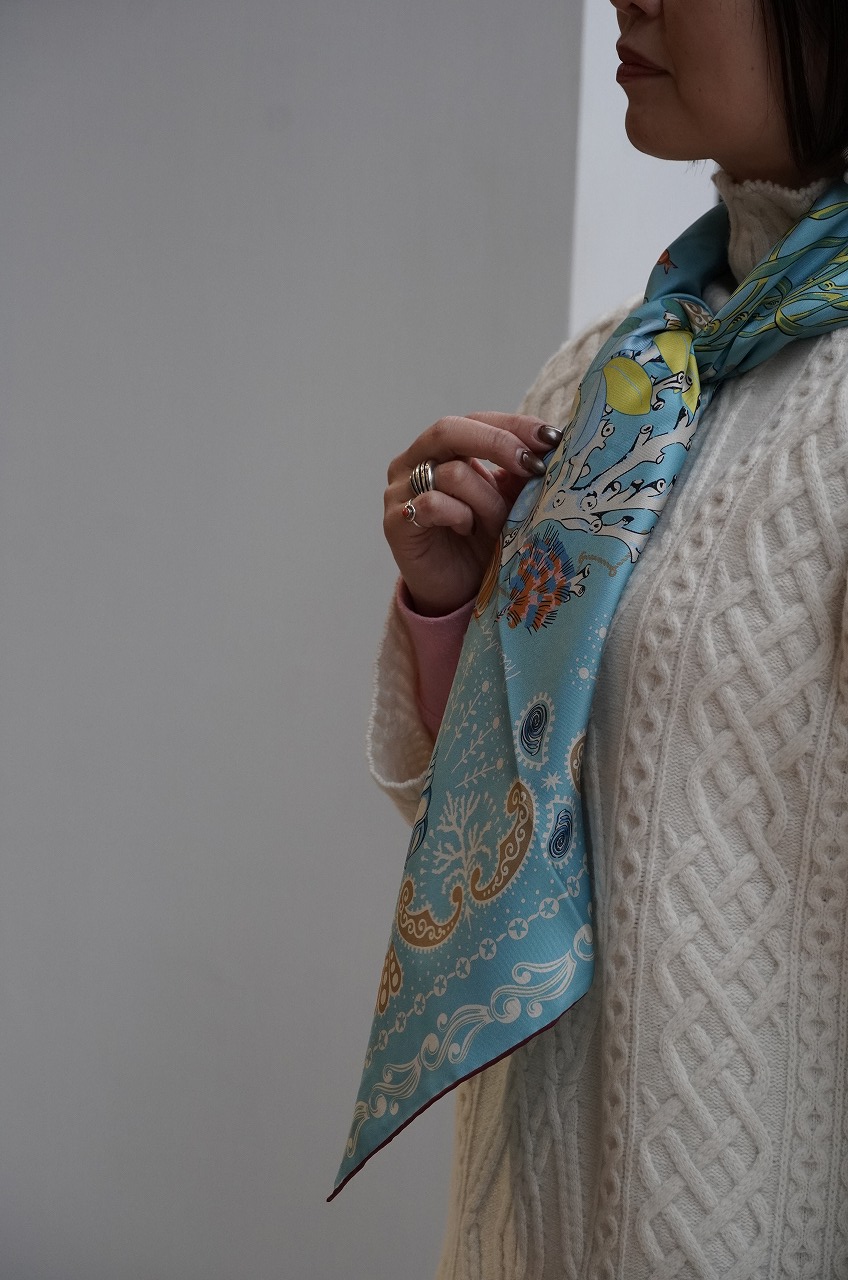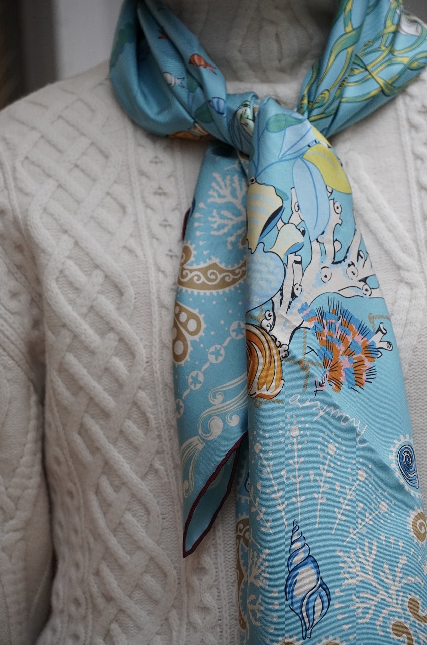 私の人生初めてのスカーフは、海の中が美しく描かれた大判の水色のスカーフを選びました(^^)