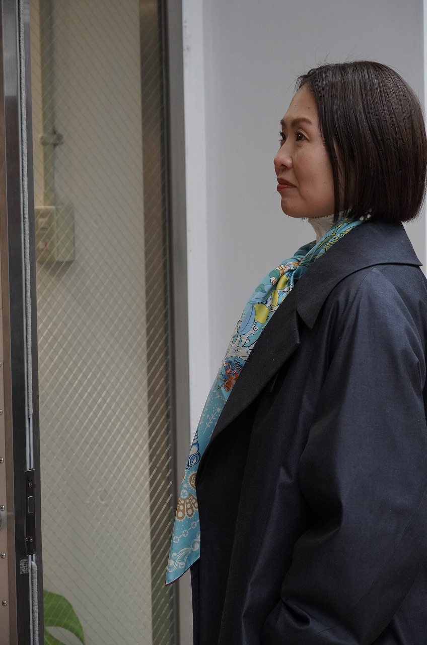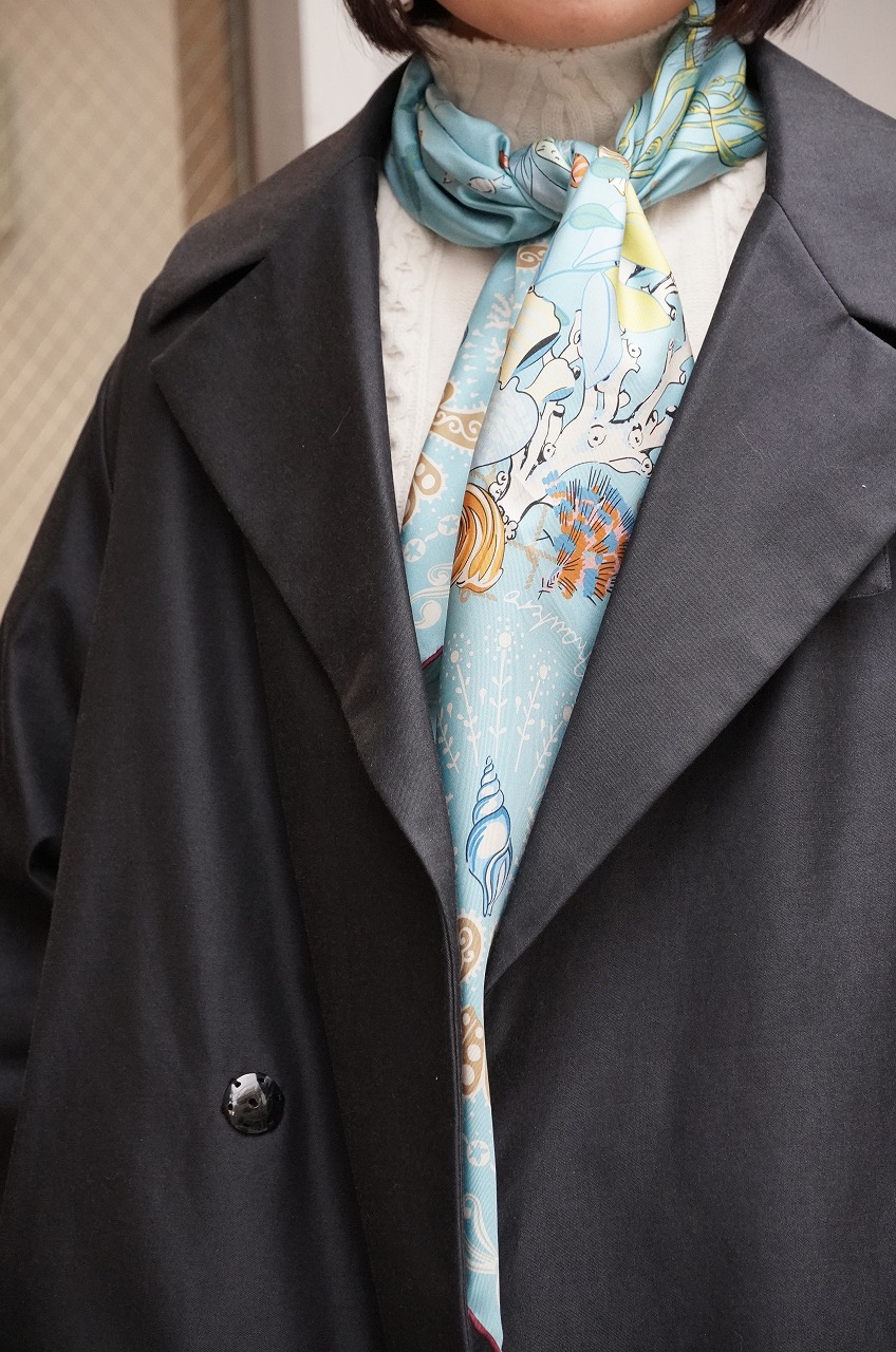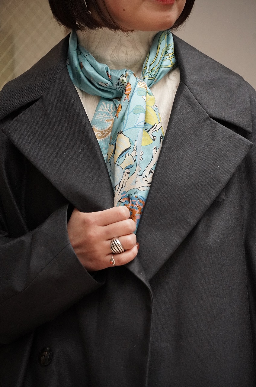 その上からコートを羽織ってみました。コートやジャケットなど落ち着いた色味のものが多かったりするので明るいものや素敵な柄ものがチラッと見えるだけで雰囲気が違います。
