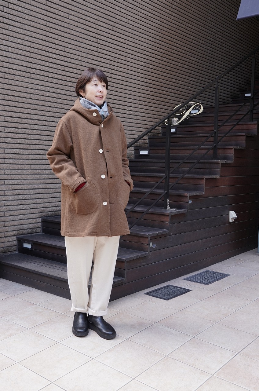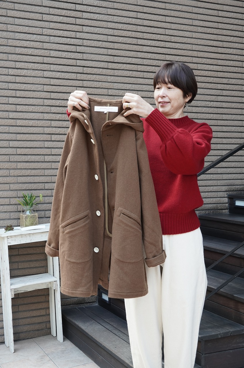 ツイードを洗い込んだような軽い素材で、明るめのブラウンの色目が秋から春まで長く着ていていただける万能選手。サンシャインやYAECA好きなお客さまは絶対お好きなデザインですね。お尻もすっぽりかくれてくれてコーディネートもしやすいです。ワンピースで合わせても可愛い。