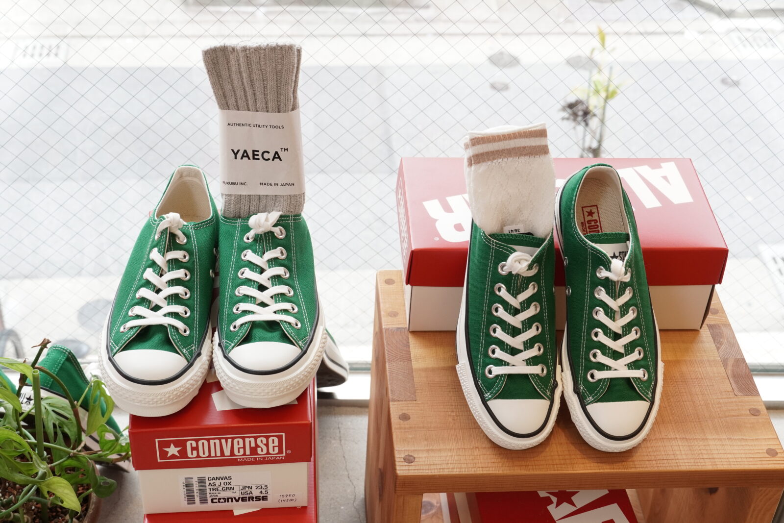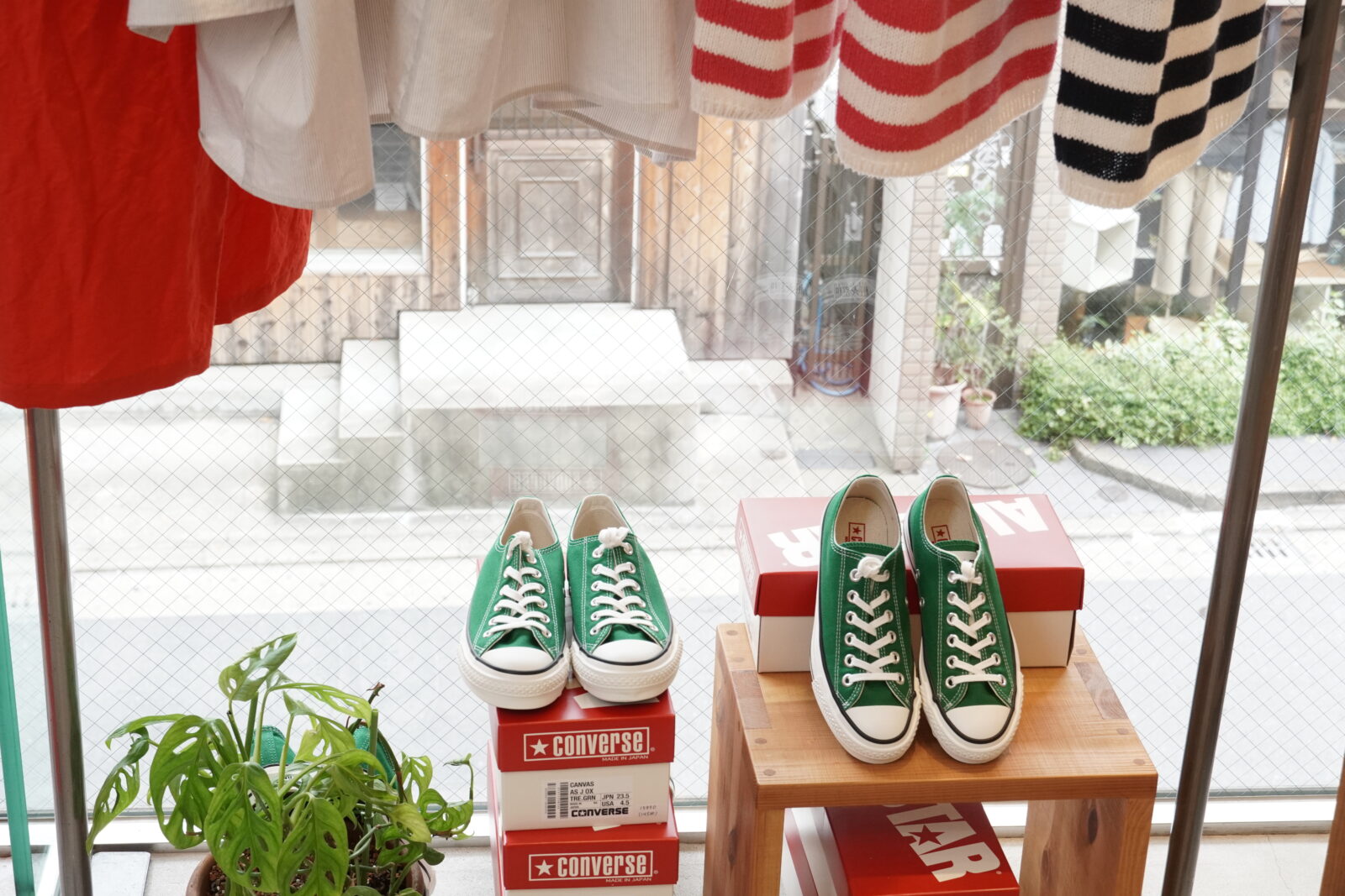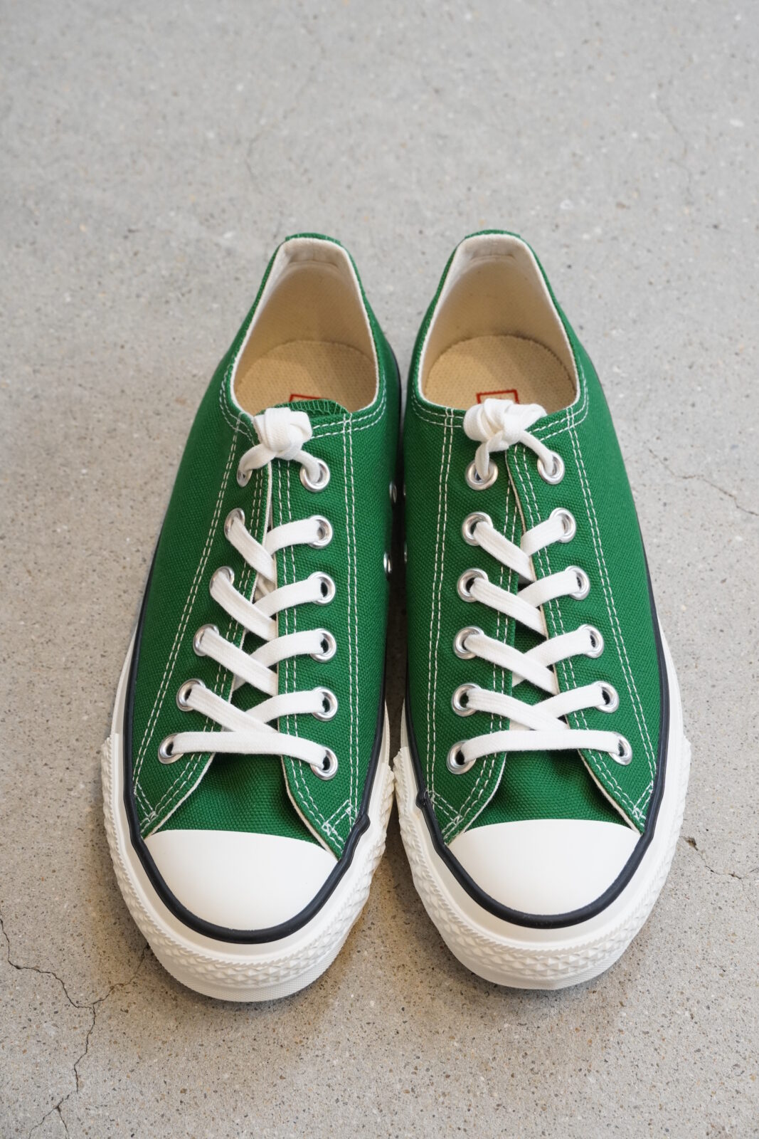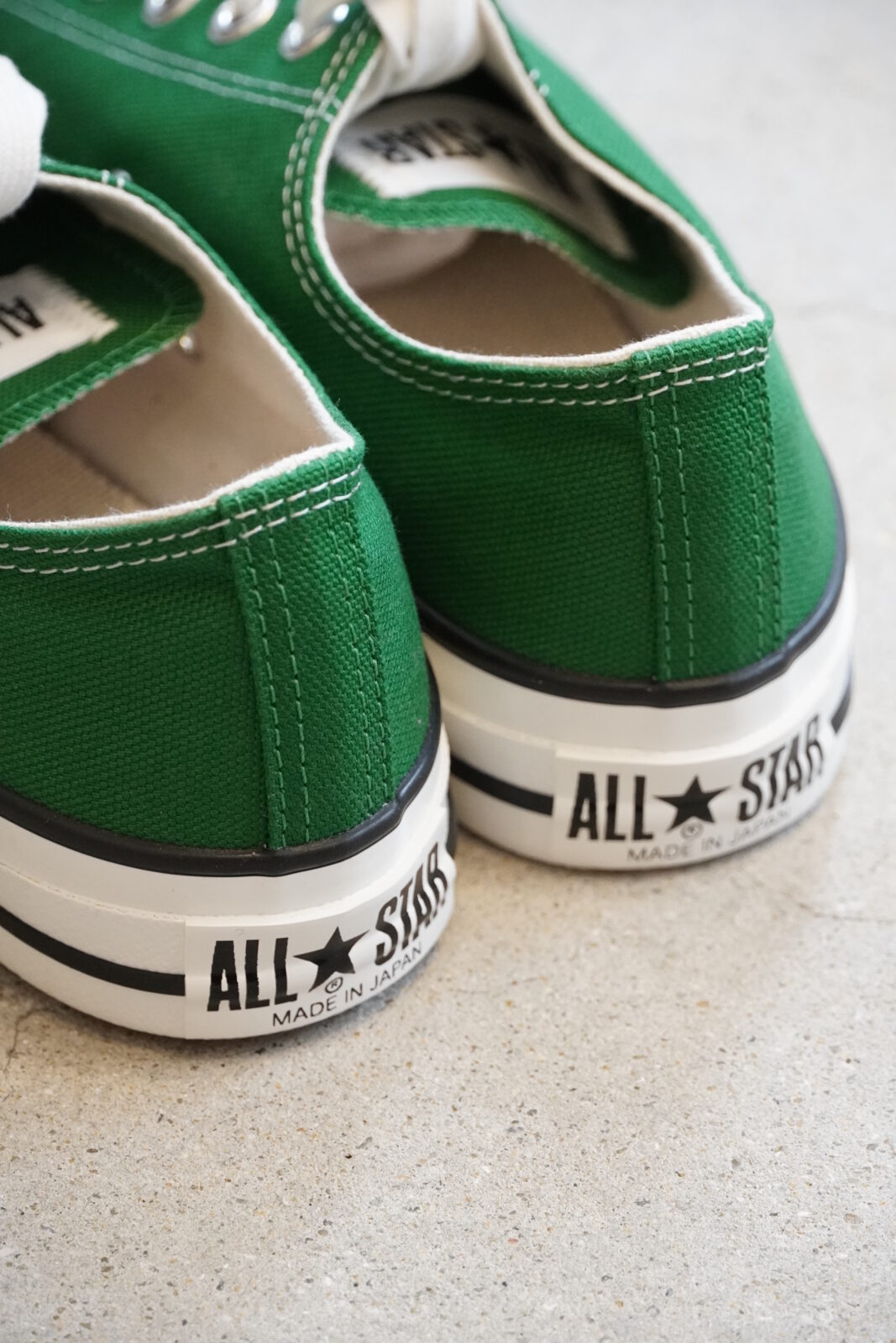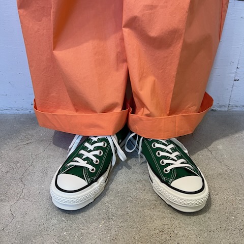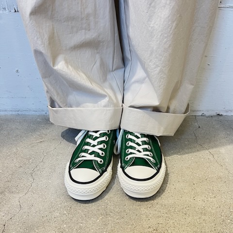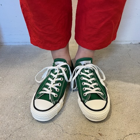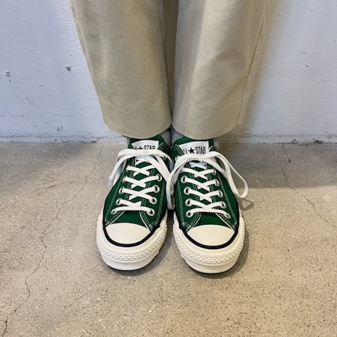 今日はコンバースのご紹介です。日本製のオールスターは履き心地も抜群で、色違いで何足もお持ちの方も多いと思います。今回は発色の良いクラシカルなツリーグリーン。春先のコーディネートにプラスされてはいかがでしょうか。深いグリーンが足もとを引き立たせてくれます。カジュアルなコーディネートにももちろん合いますが、きれいめなものとも相性が良いんです(^^)