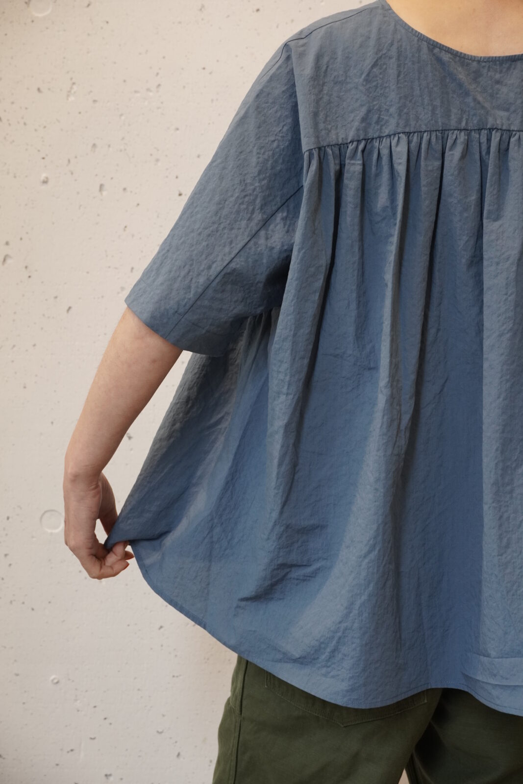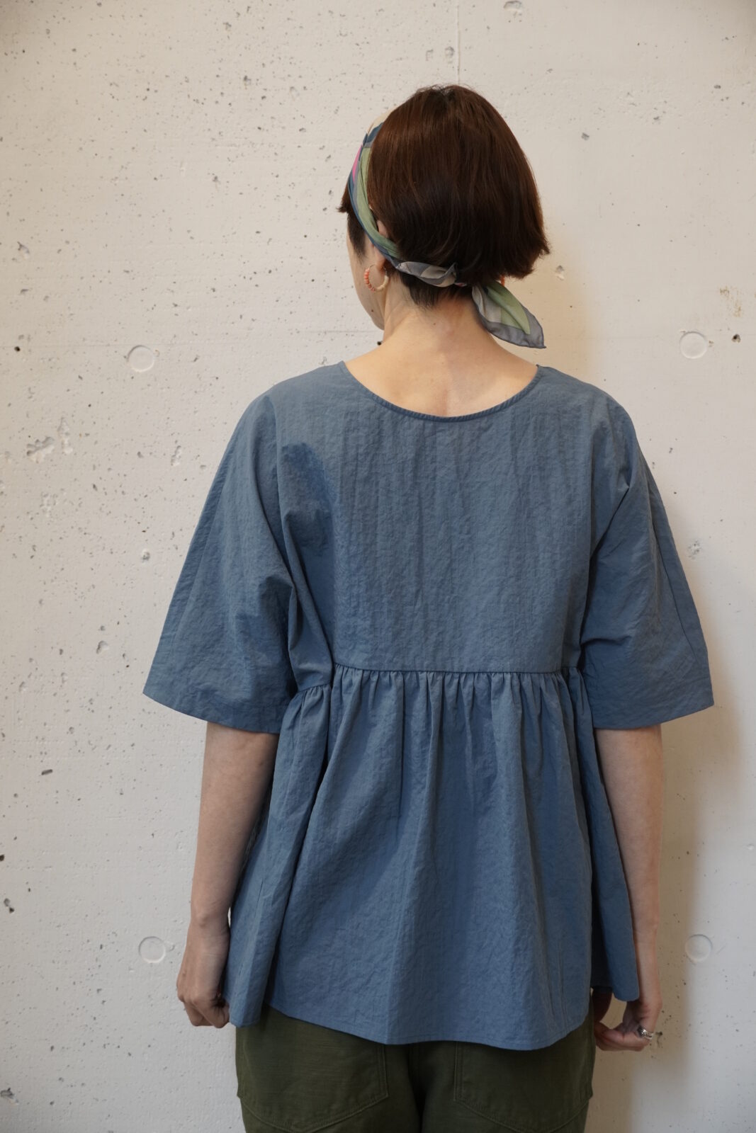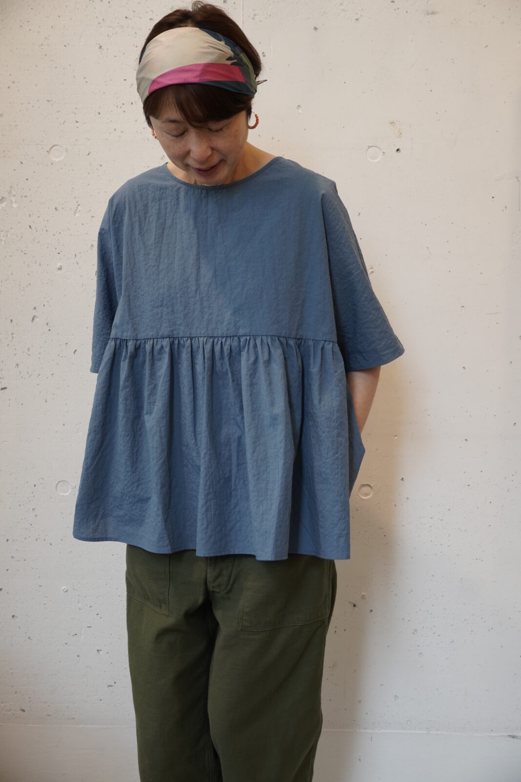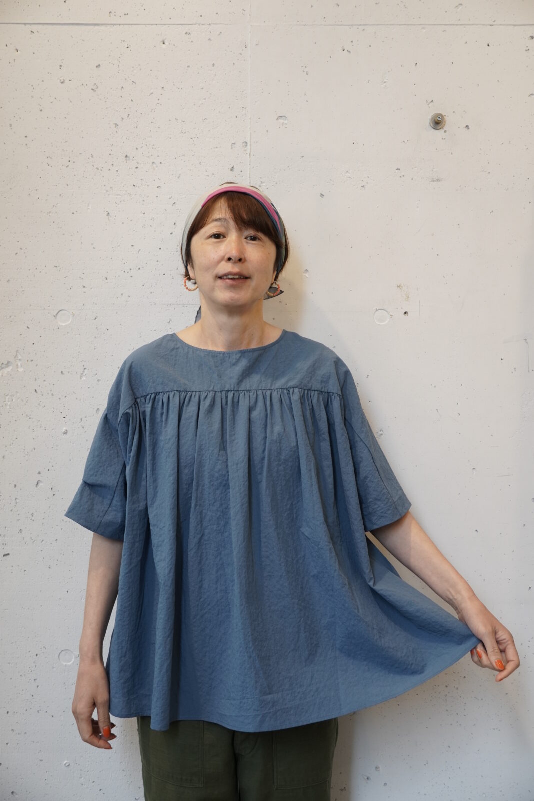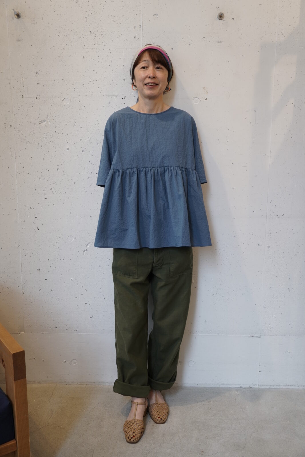 きれいなシュガーブルーギャザーシャツは、落ち着いた水色で肌馴染みも良く、カジュアルなパンツはもちろん、きれいめなパンツやスカートなど、コーディネートの幅も広がる1枚です。