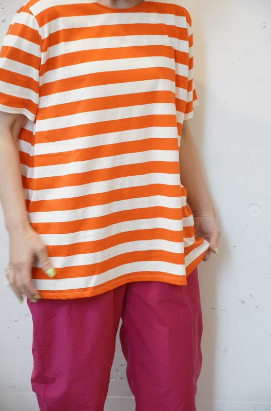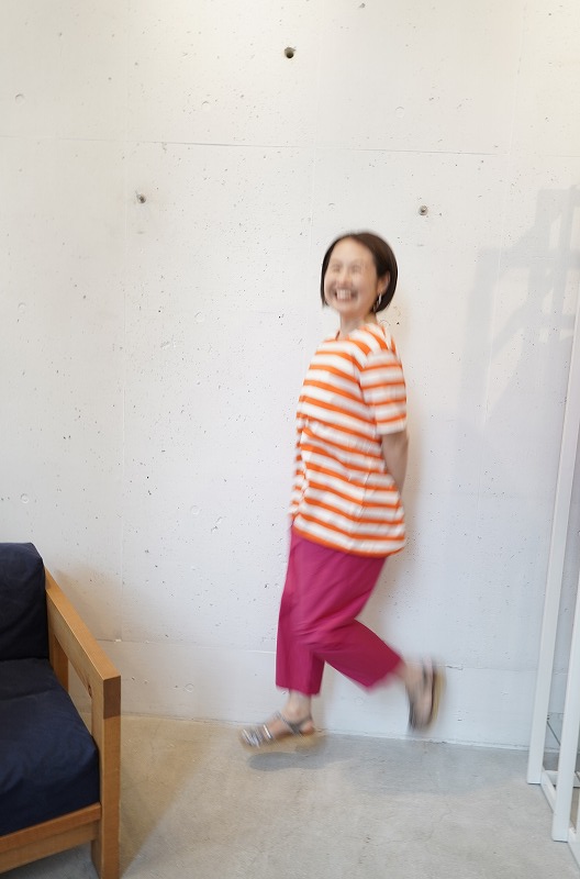 最後にラズベリー色のパンツをオレンジのボーダーと合わせて。きれいな色の組み合わせに嬉しくなって飛び跳ねてしまいました(笑)ブレブレ写真ですみません。