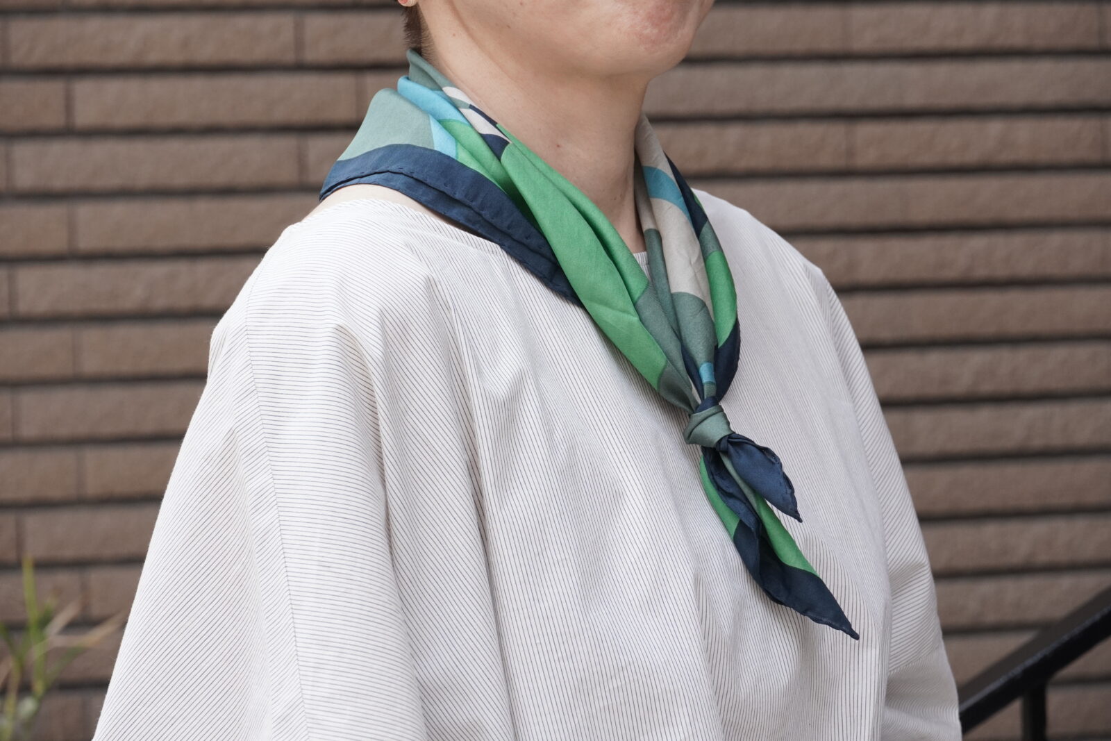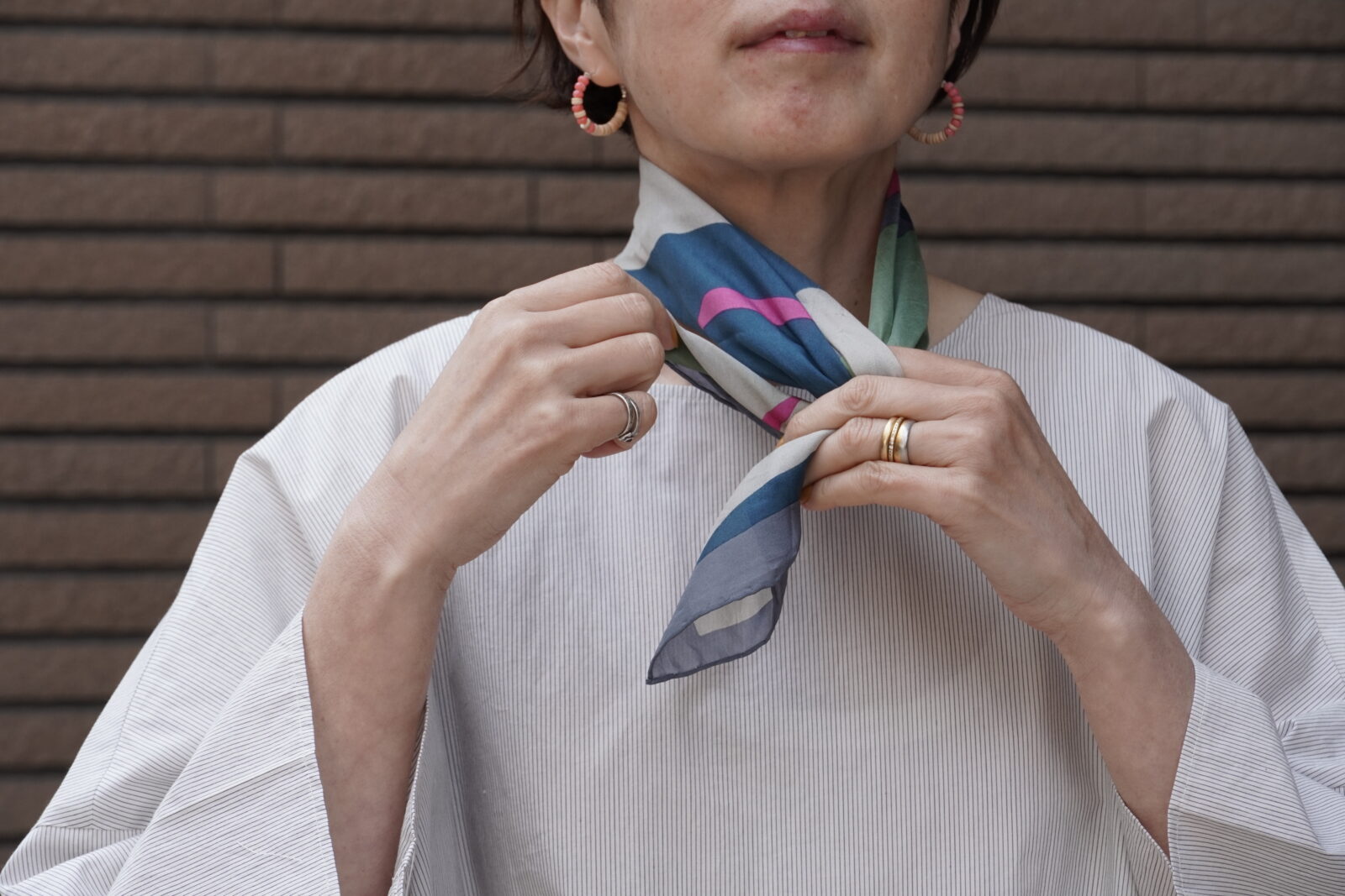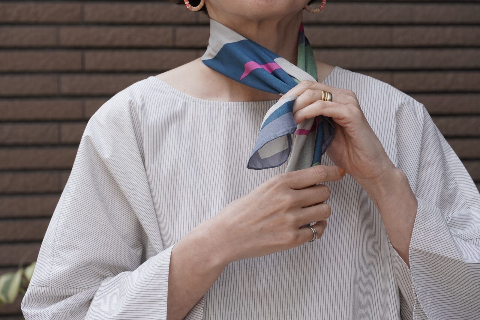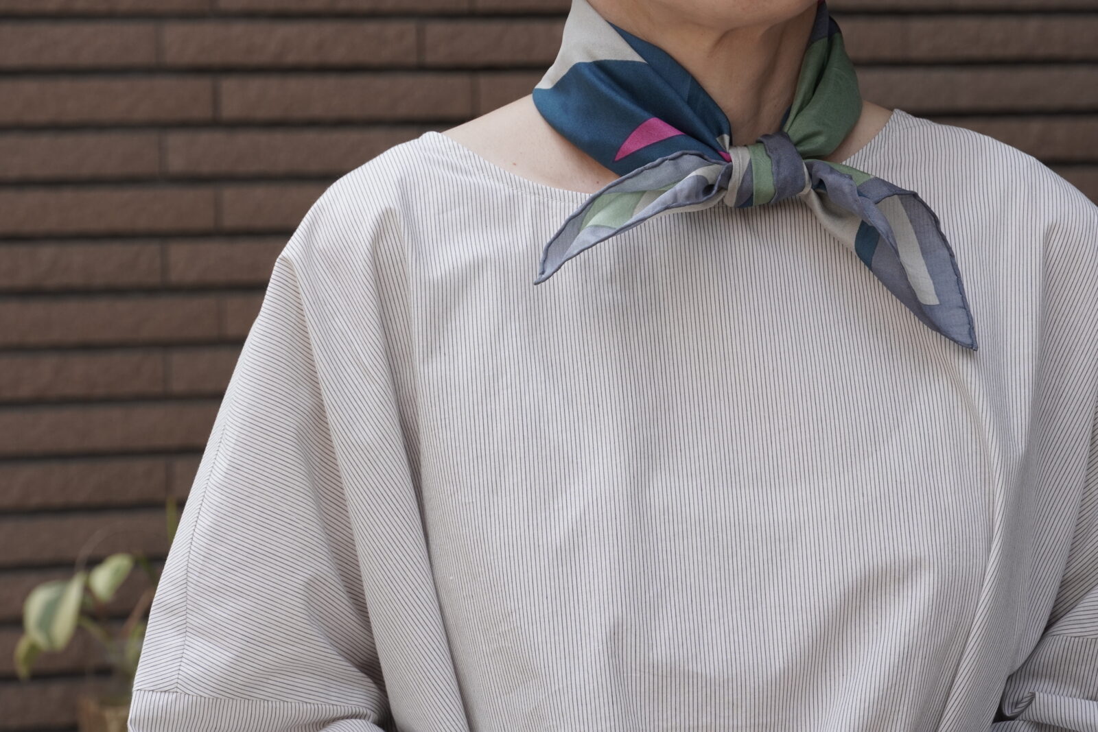 小さめのスカーフなので、主張しすぎず、華やかさがプラスされていいバランスです。