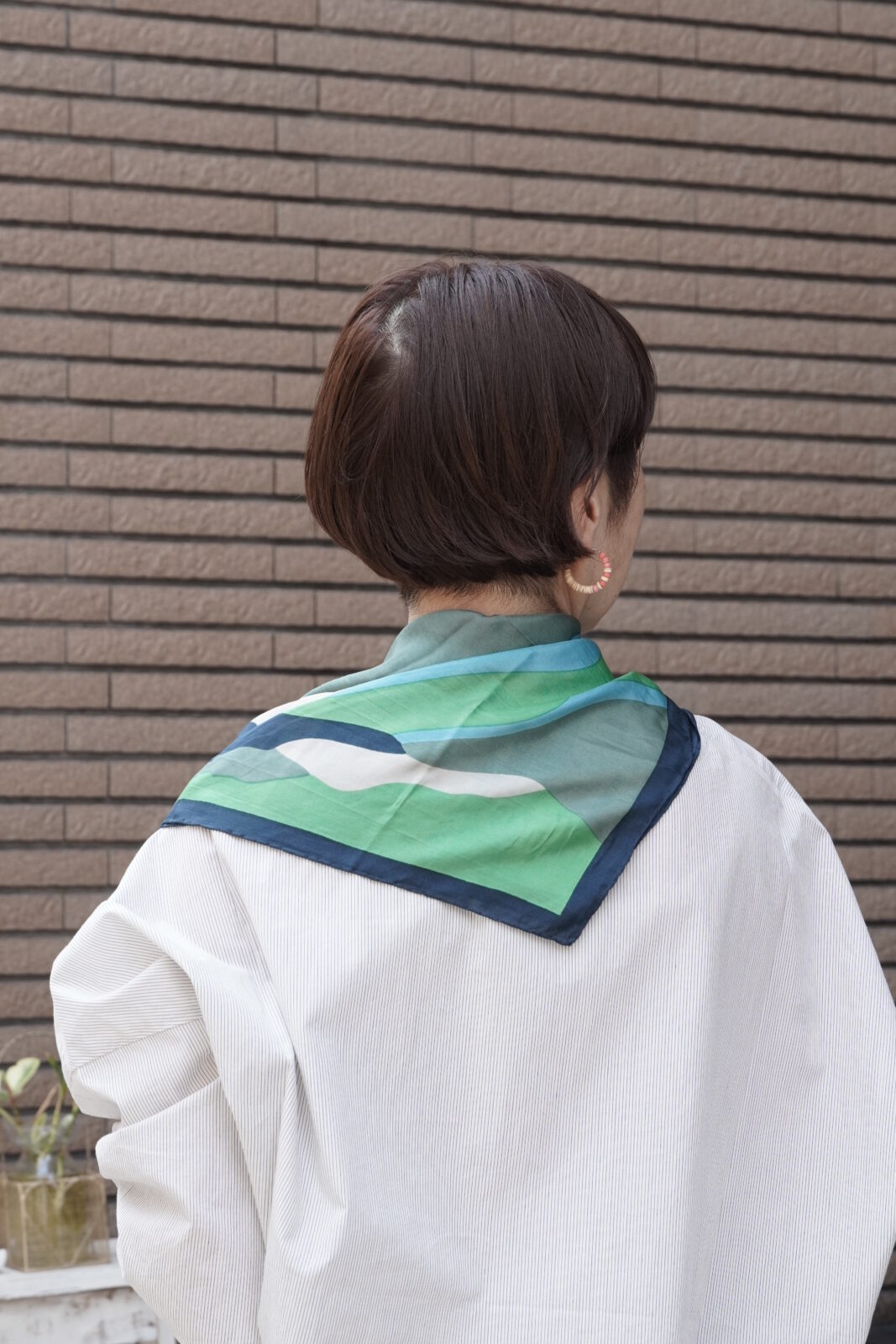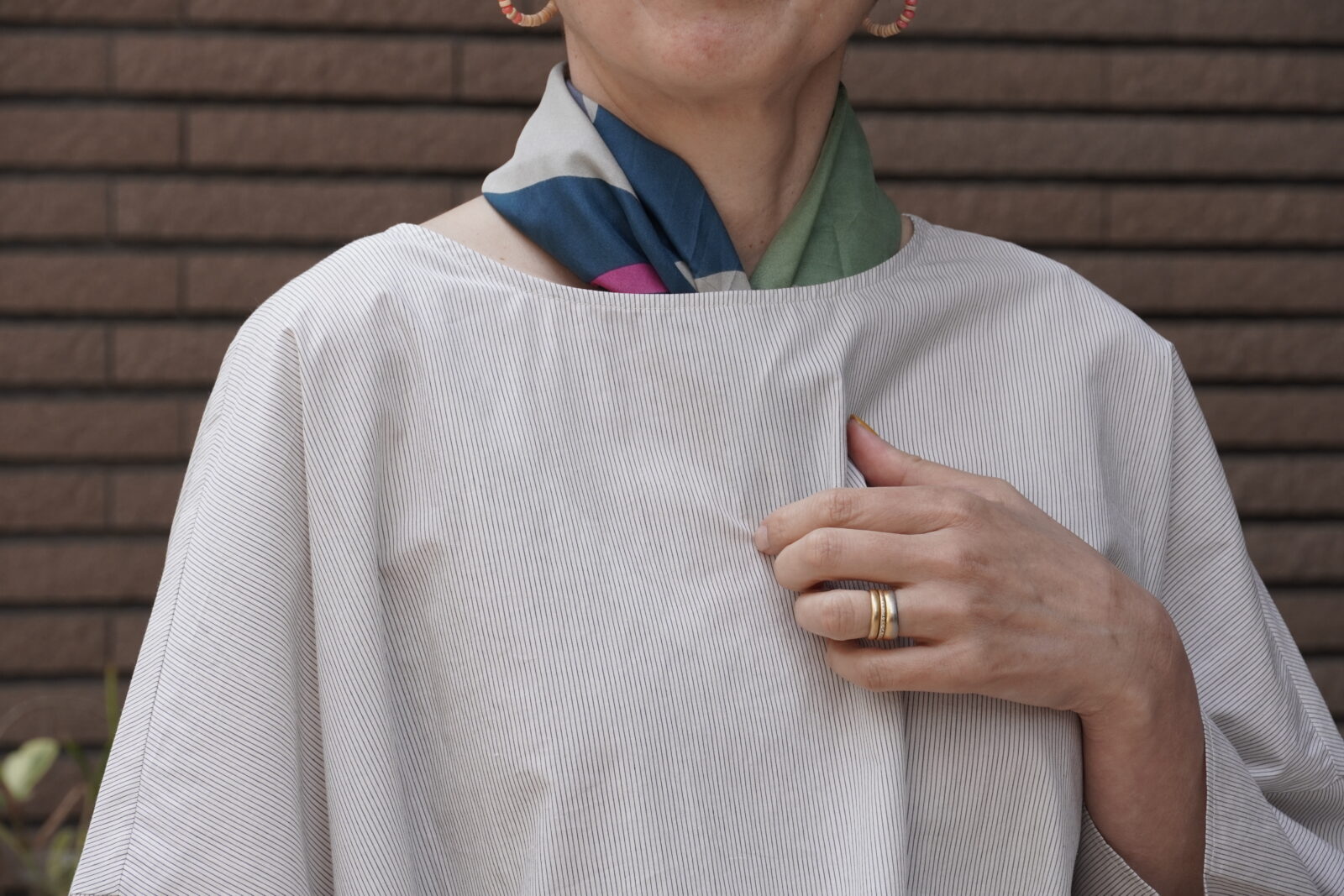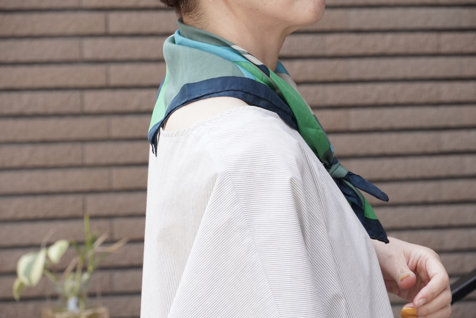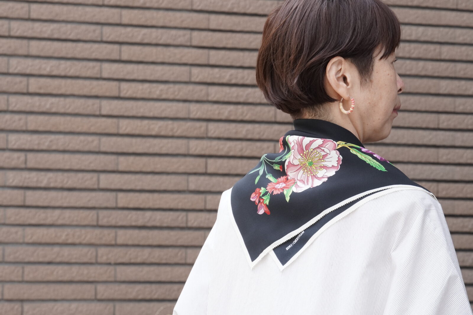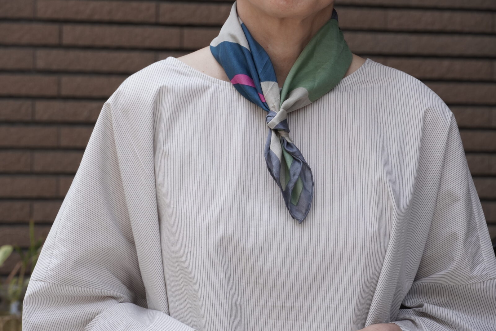 小さめのスカーフなので、主張しすぎず、華やかさがプラスされていいバランスです。