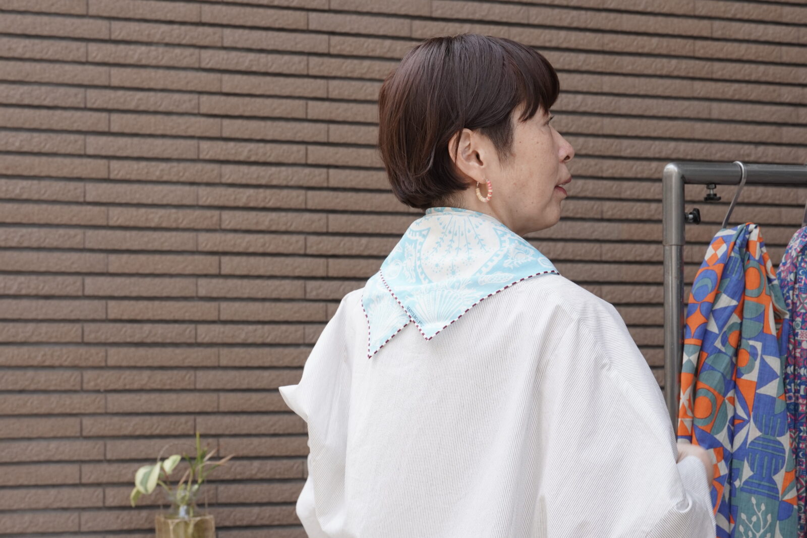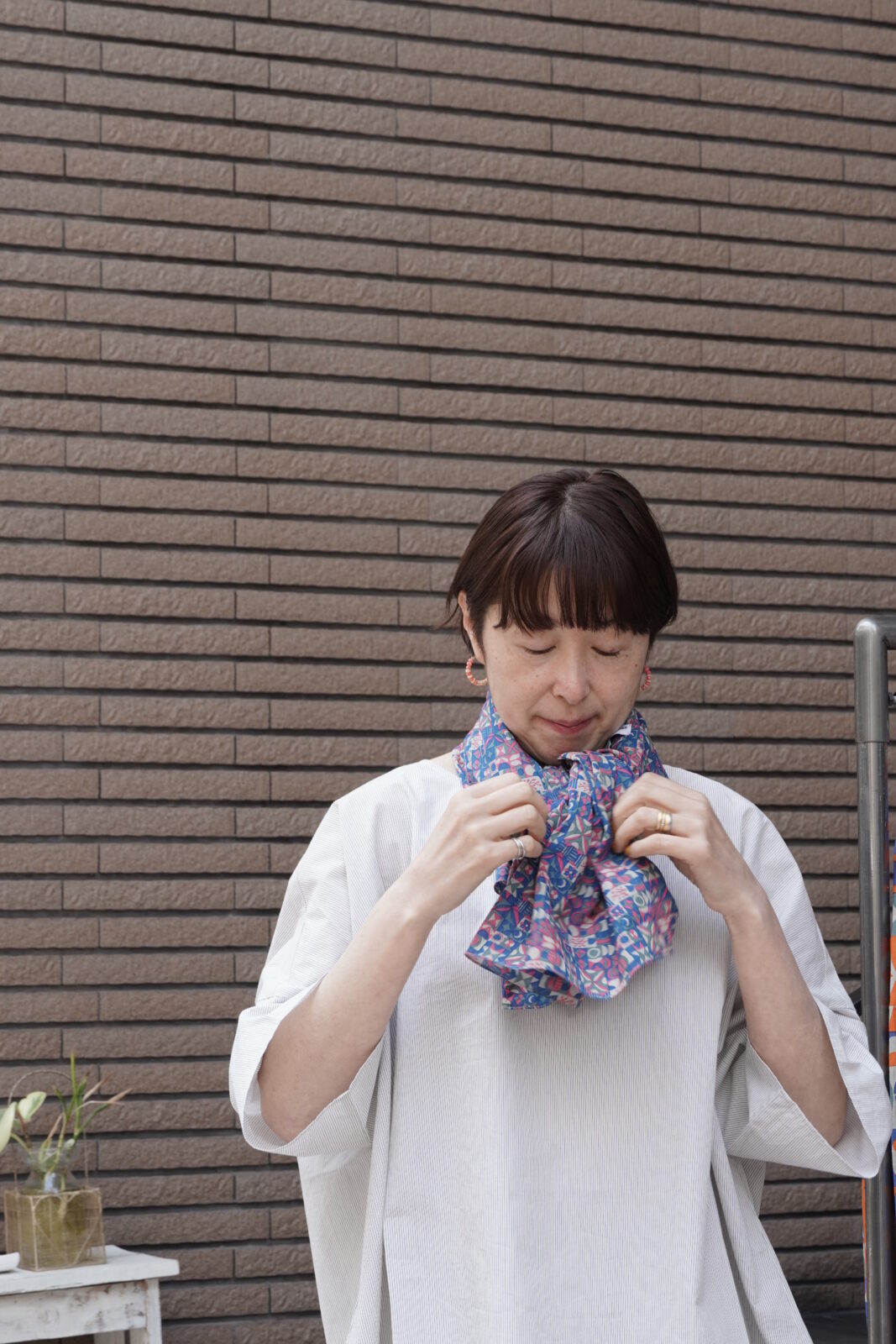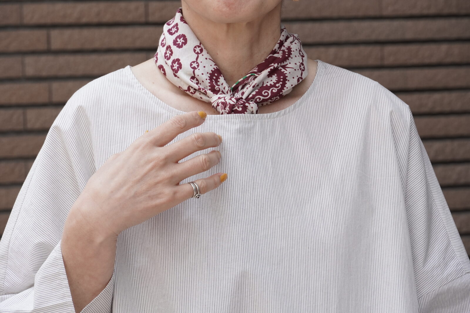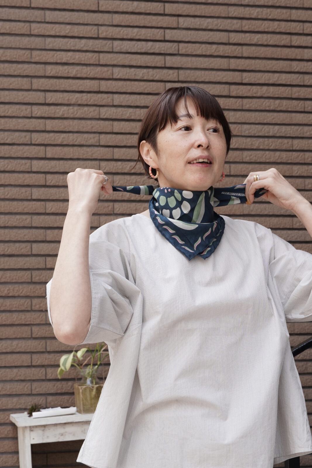 小さめのスカーフなので、主張しすぎず、華やかさがプラスされていいバランスです。
