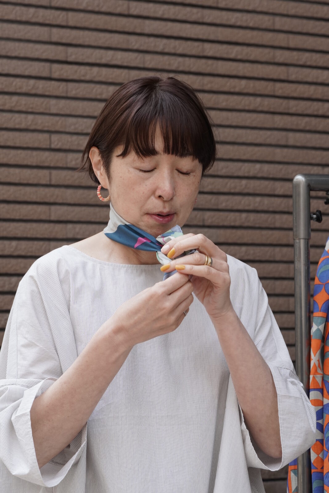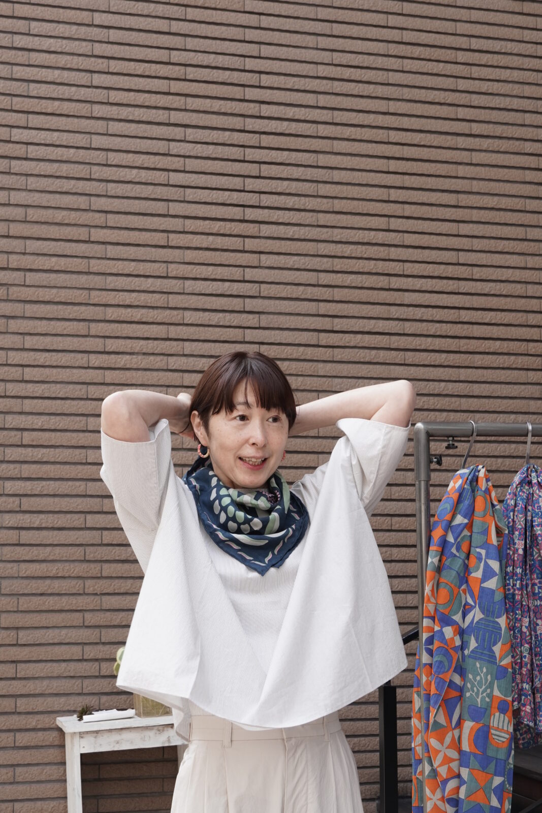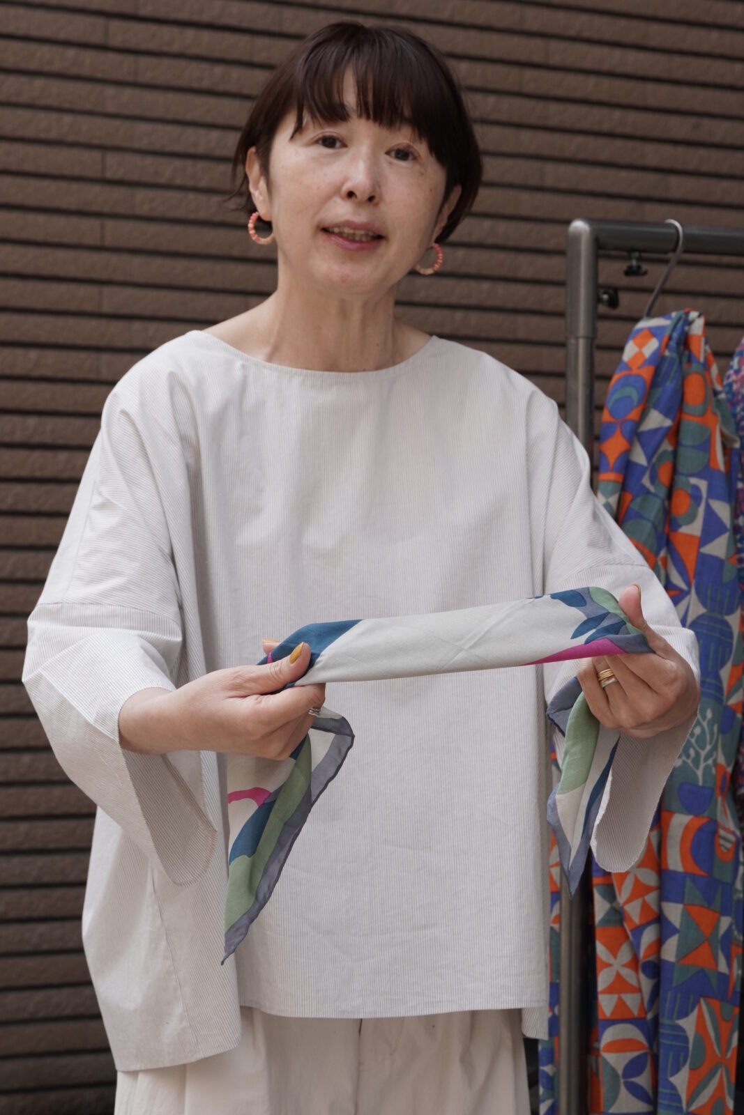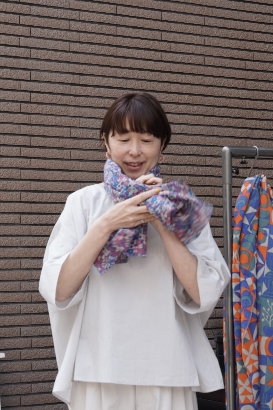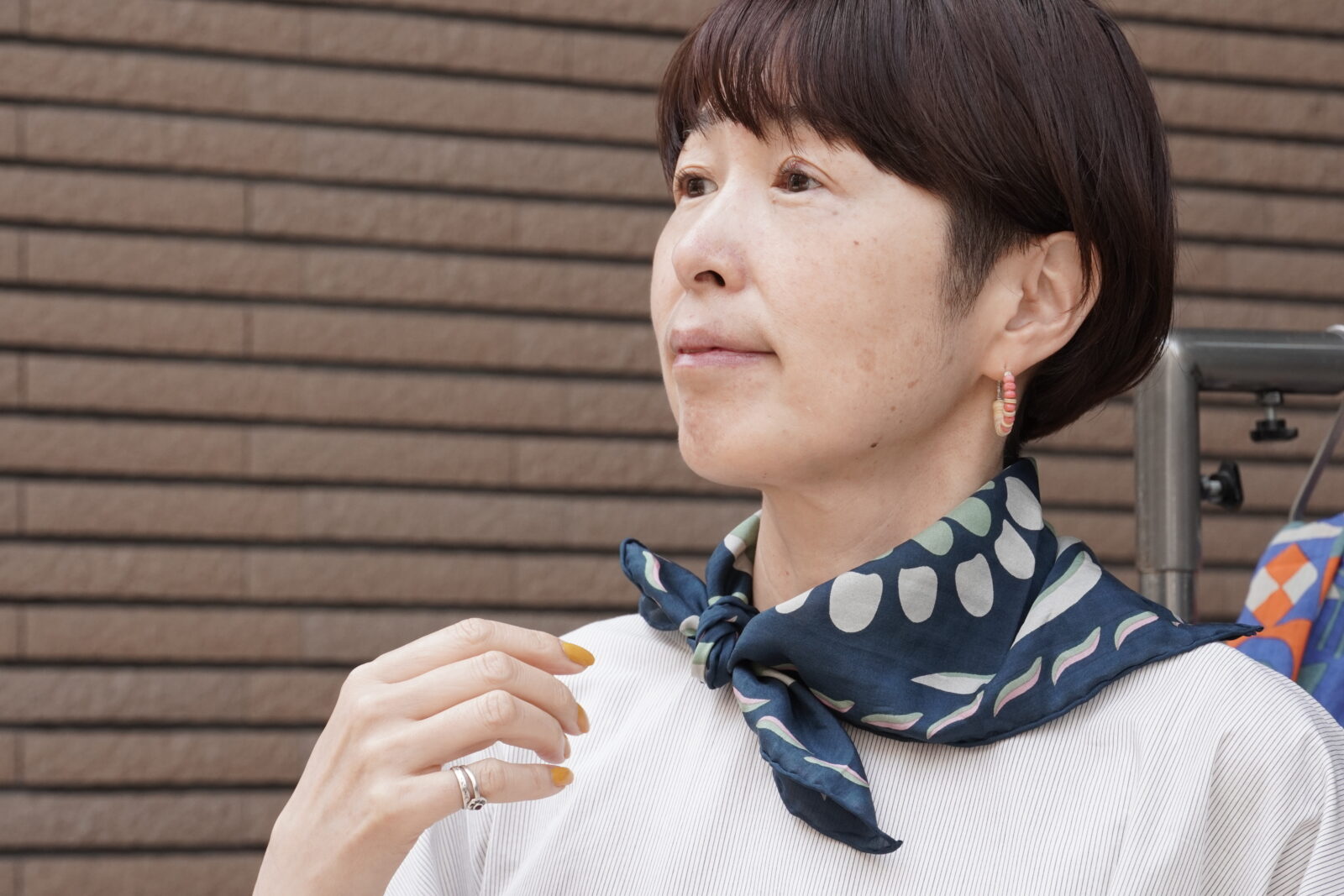 小さめのスカーフなので、主張しすぎず、華やかさがプラスされていいバランスです。