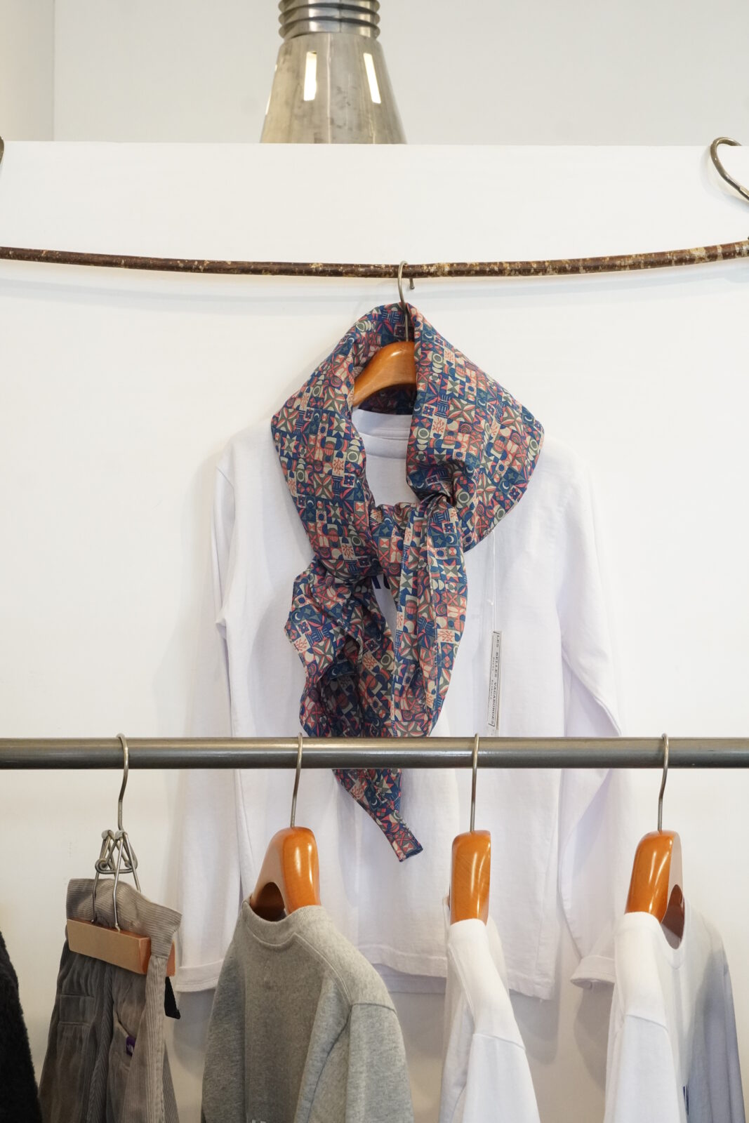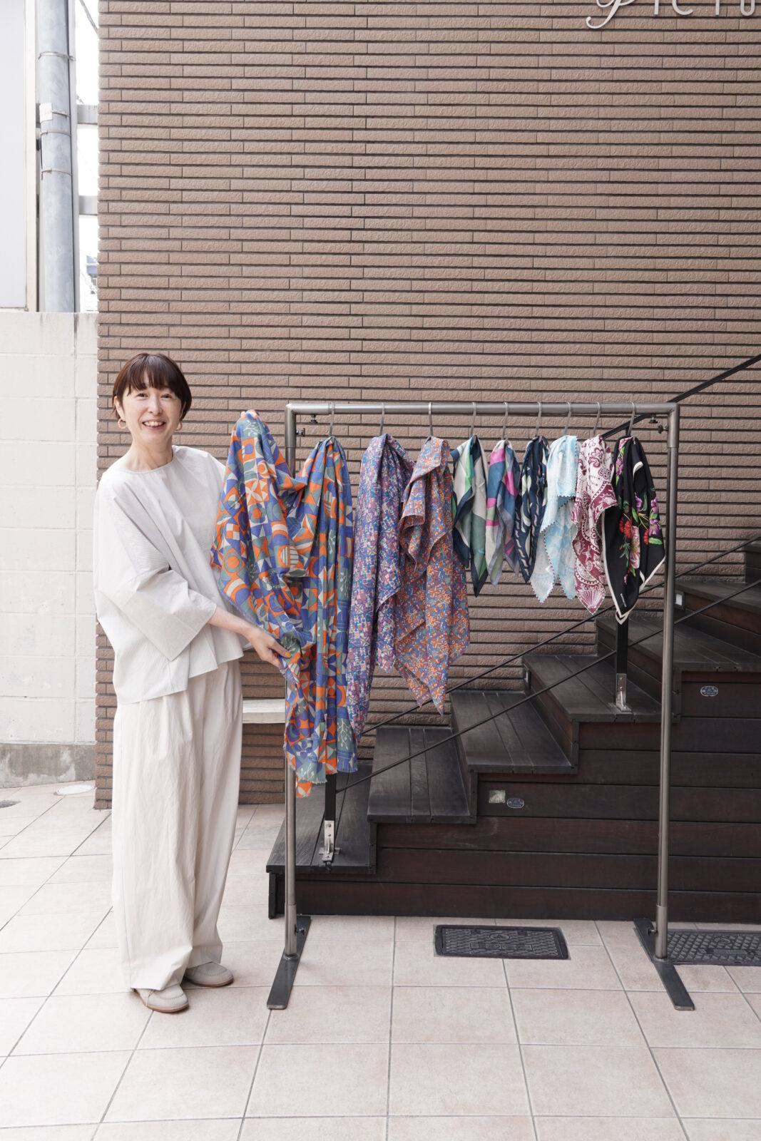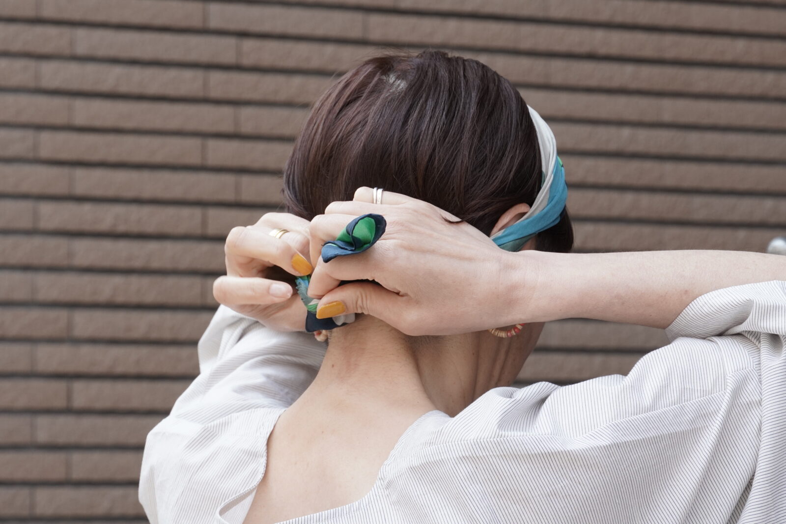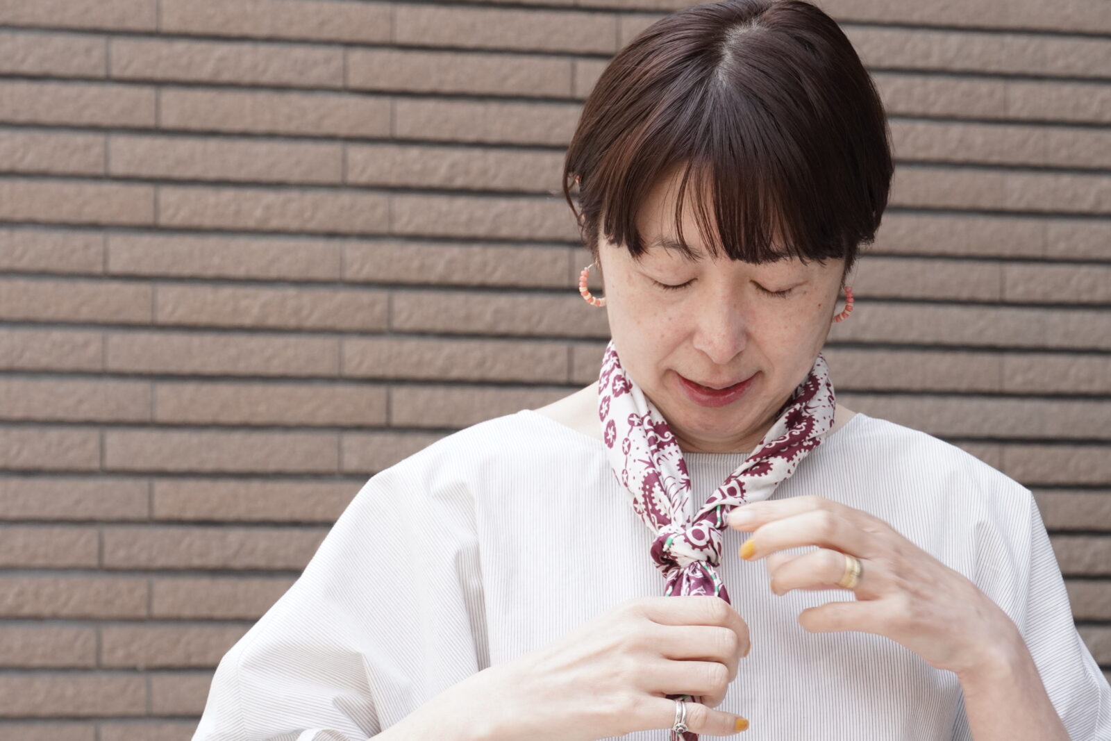 小さめのスカーフなので、主張しすぎず、華やかさがプラスされていいバランスです。