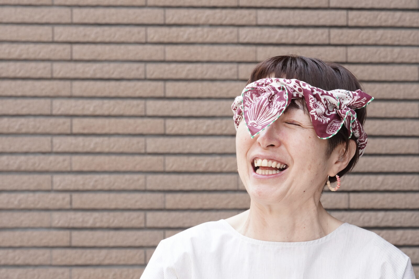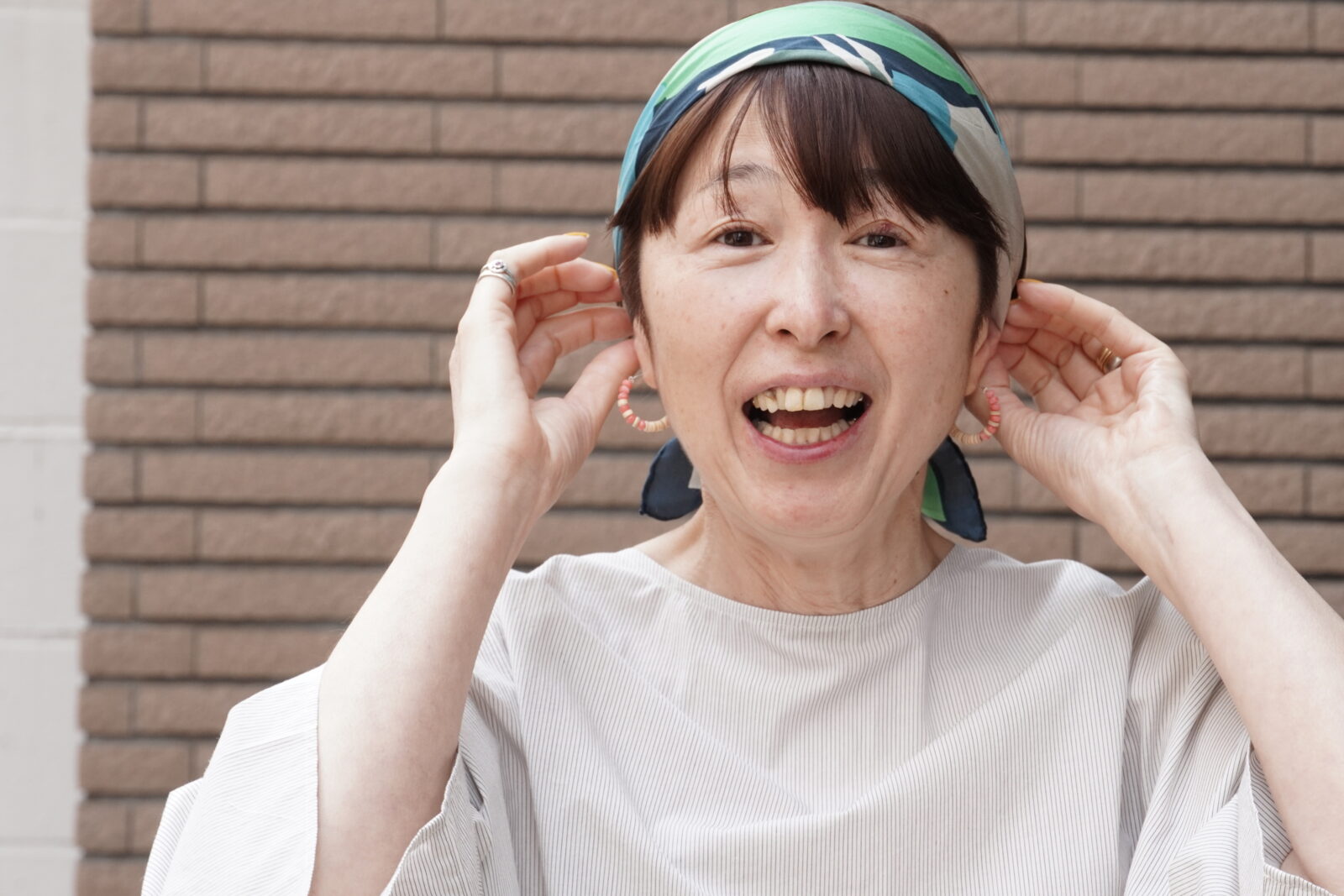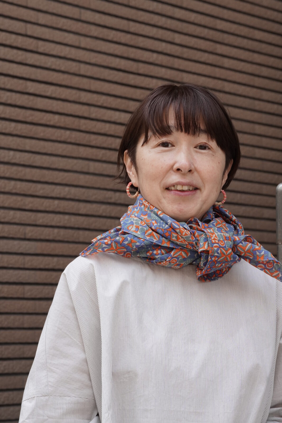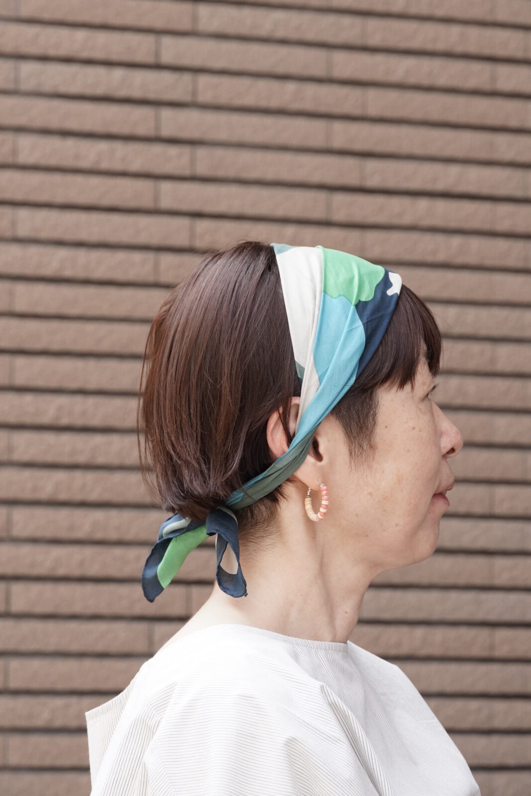 鮮やかなオレンジ色と落ち着いた色合いが絶妙なバランスで、顔周りを明るくしてくれます。