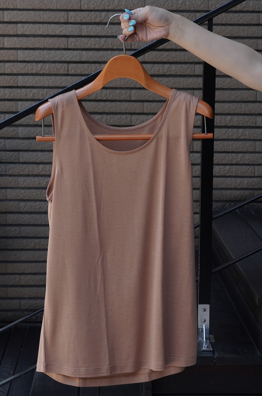 エシュペーさんのノースリーブはすっきっりとしたシルエットでハリのある生地感。